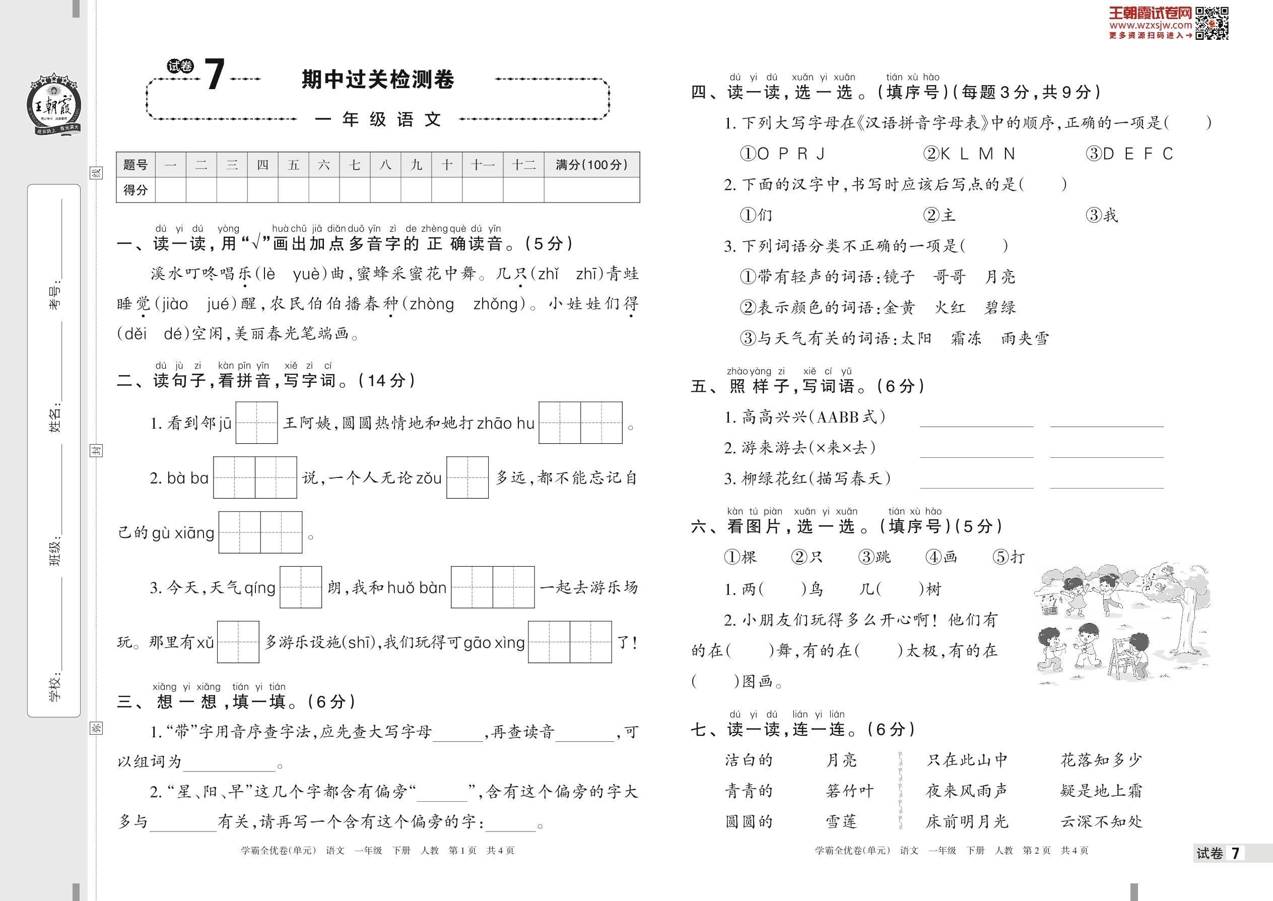 2023下册一年级语文人教版 试卷7 期中过关检测卷