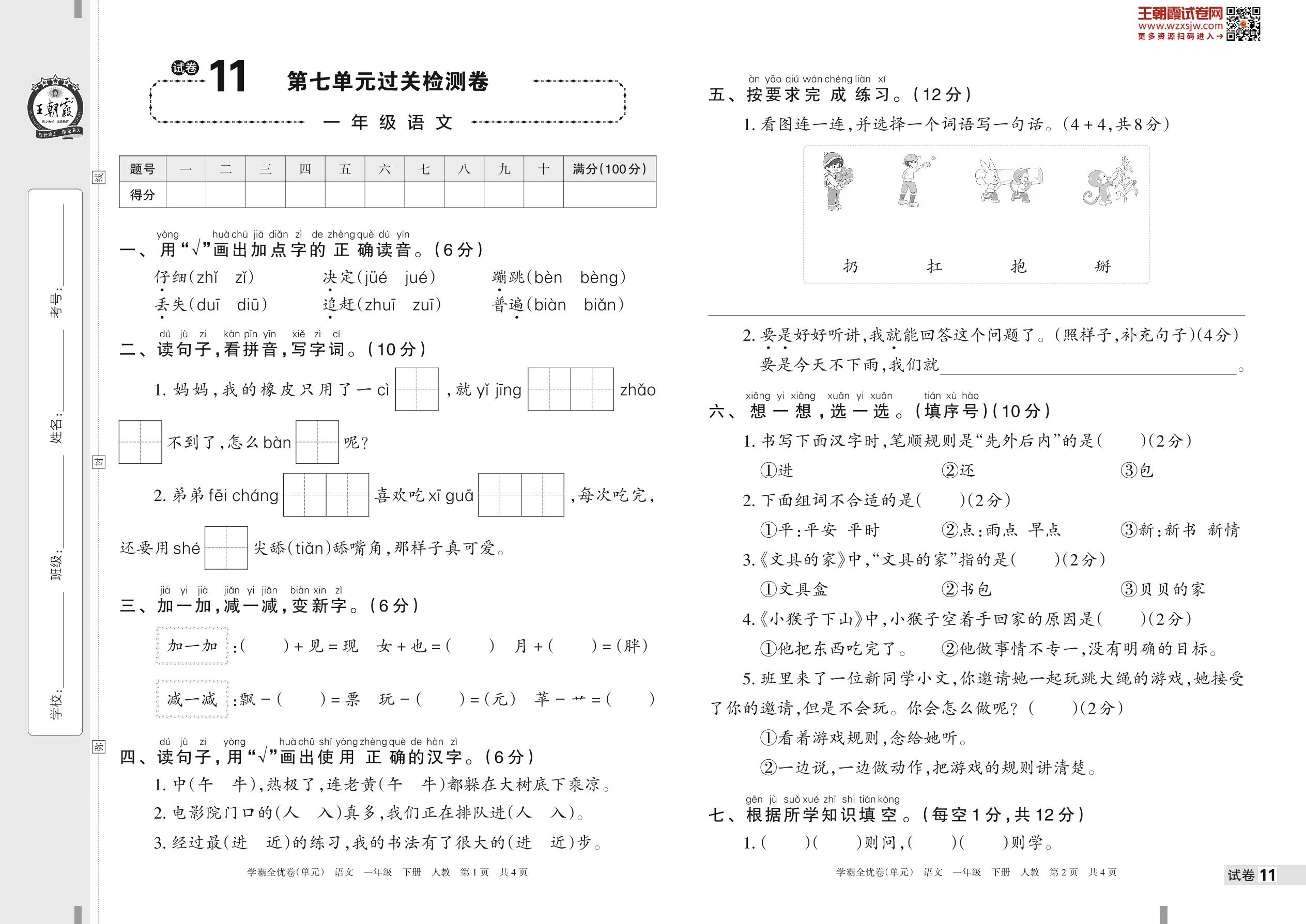 2023下册一年级语文人教版 试卷11 第七单元过关检测卷