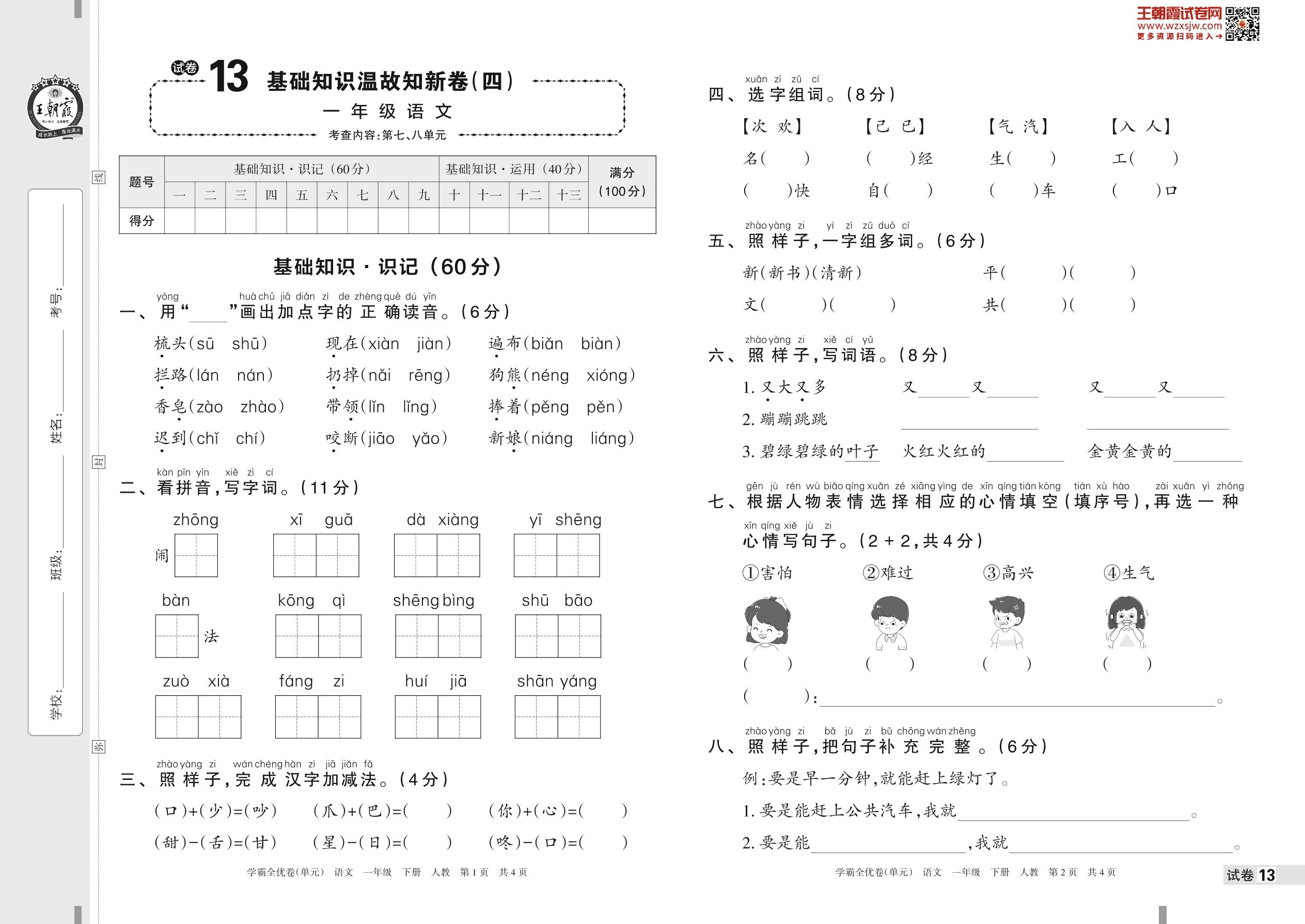 2023下册一年级语文人教版 试卷13 基础知识温故知新卷(四)