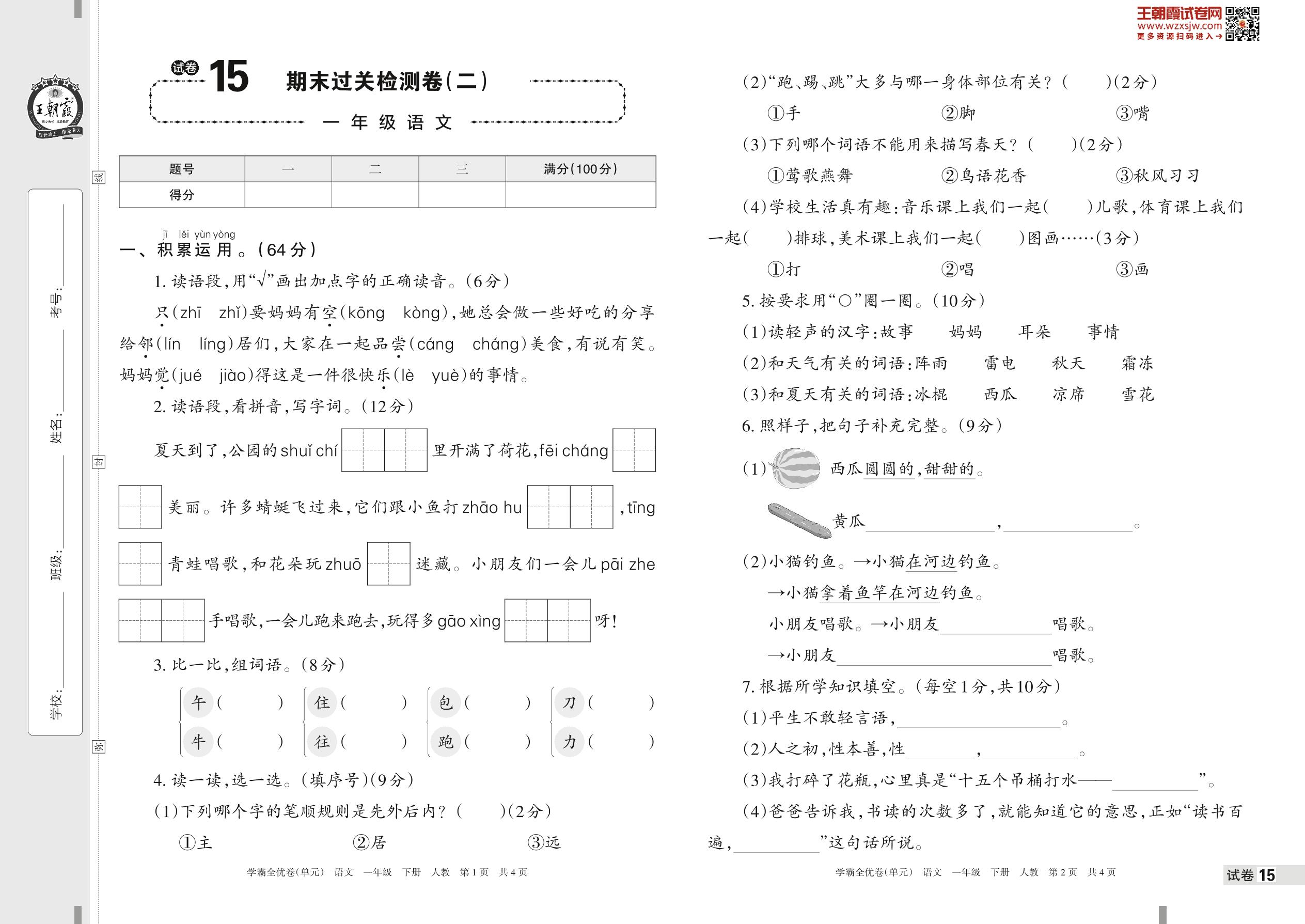 2023下册一年级语文人教版 试卷15 期末过关检测卷(二)