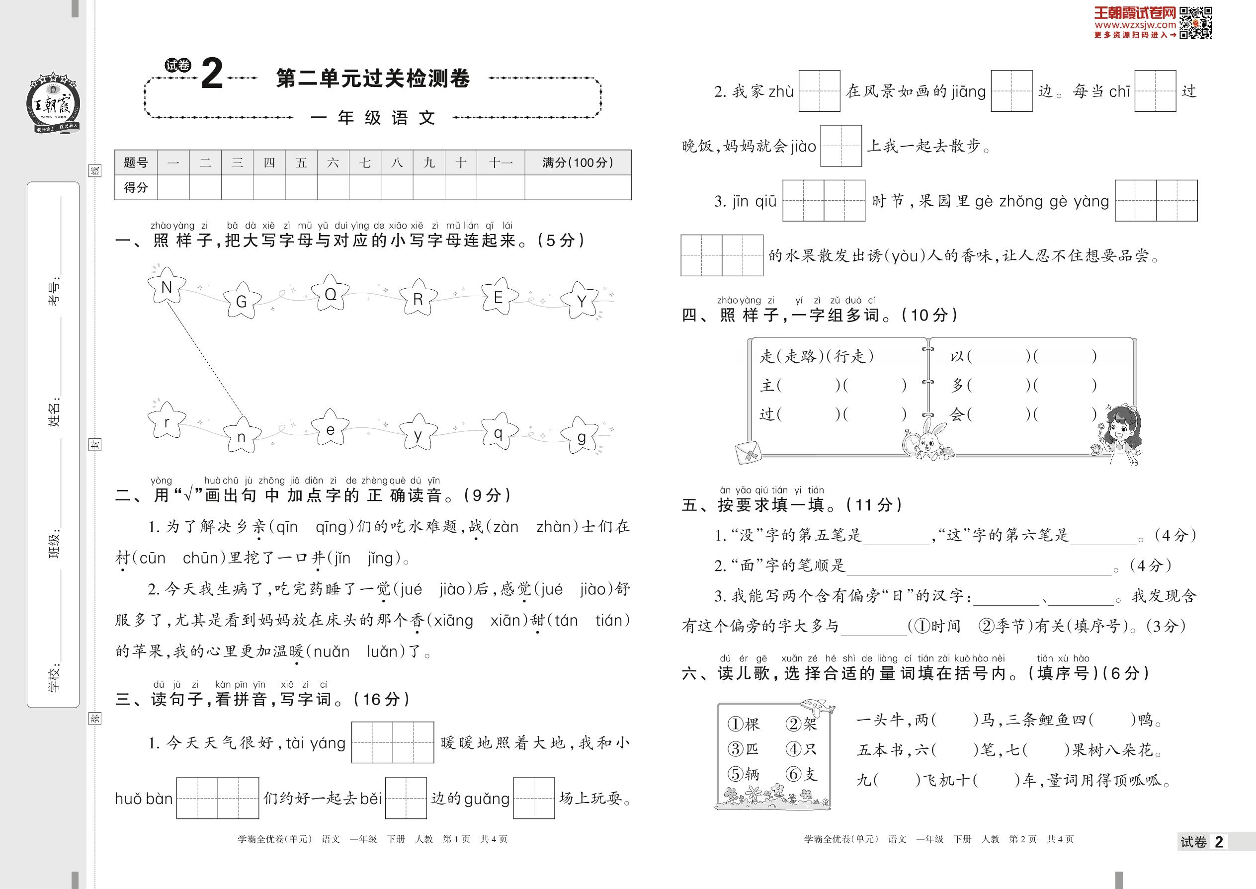 2023下册一年级语文人教版 试卷2 第二单元过关检测卷