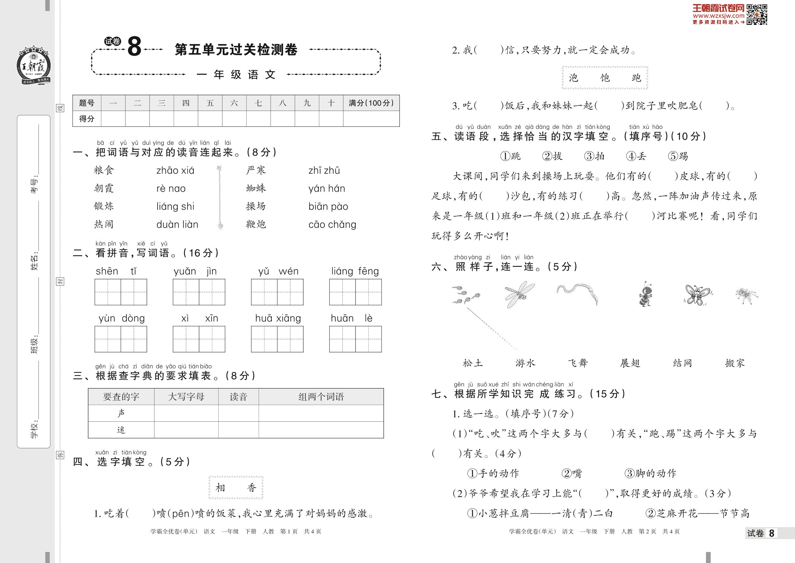 2023下册一年级语文人教版 试卷8 第五单元过关检测卷