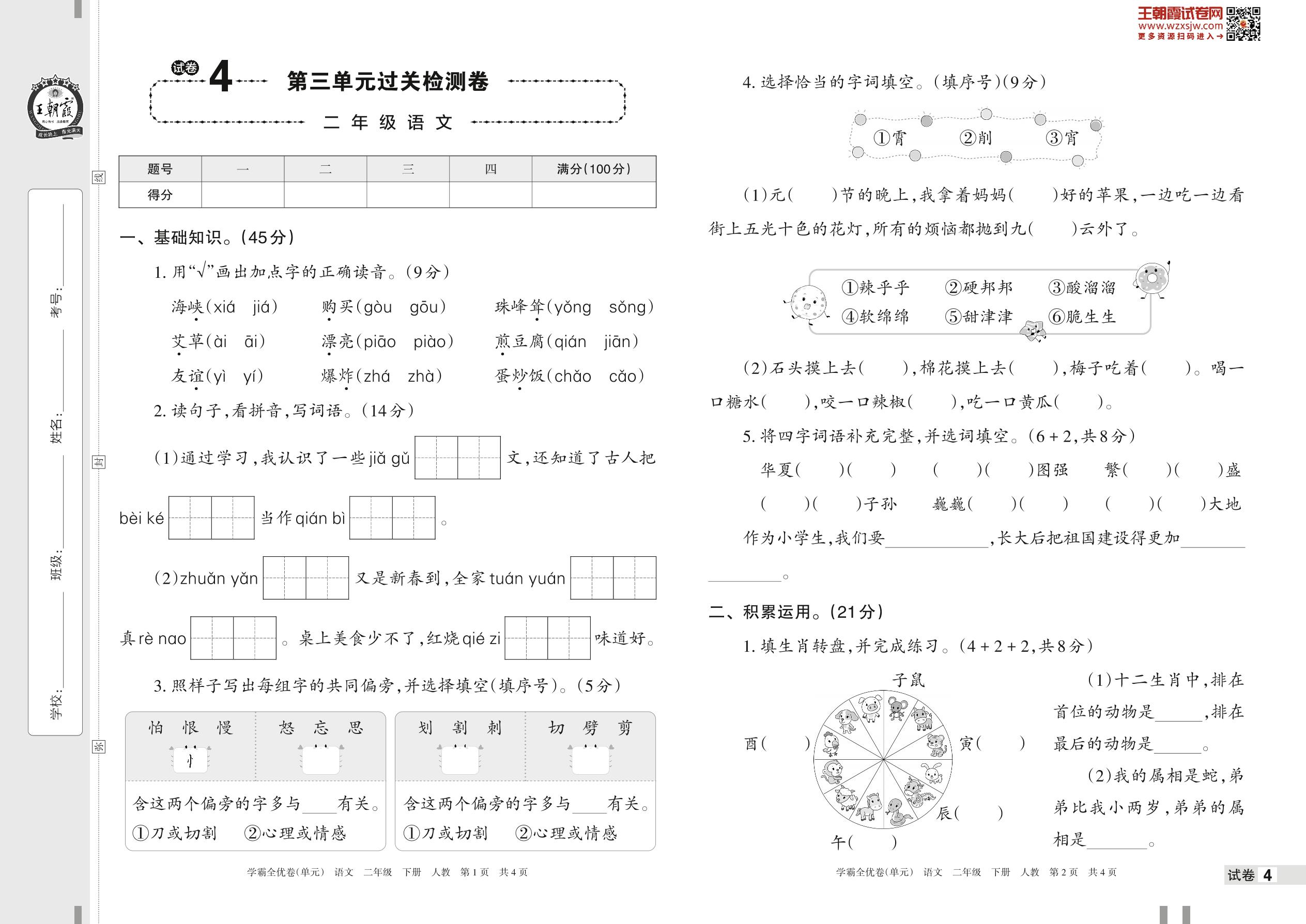 2023下册二年级语文人教版 试卷4 第三单元过关检测卷