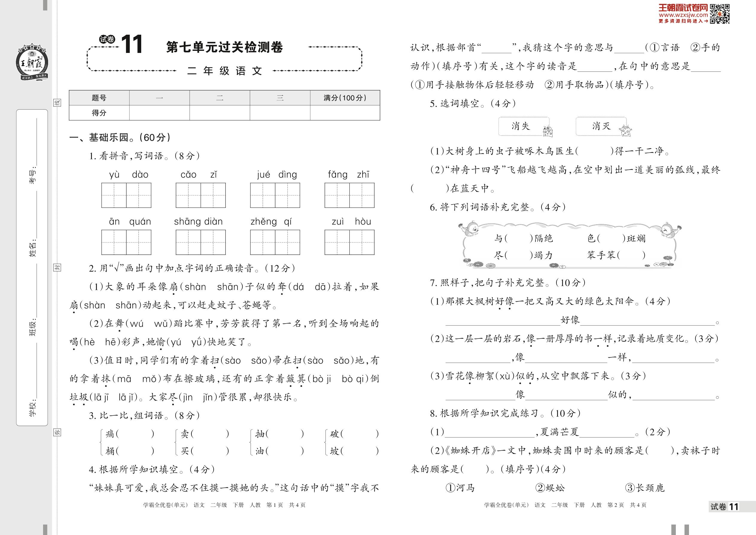 2023下册二年级语文人教版 试卷11 第七单元过关检测卷