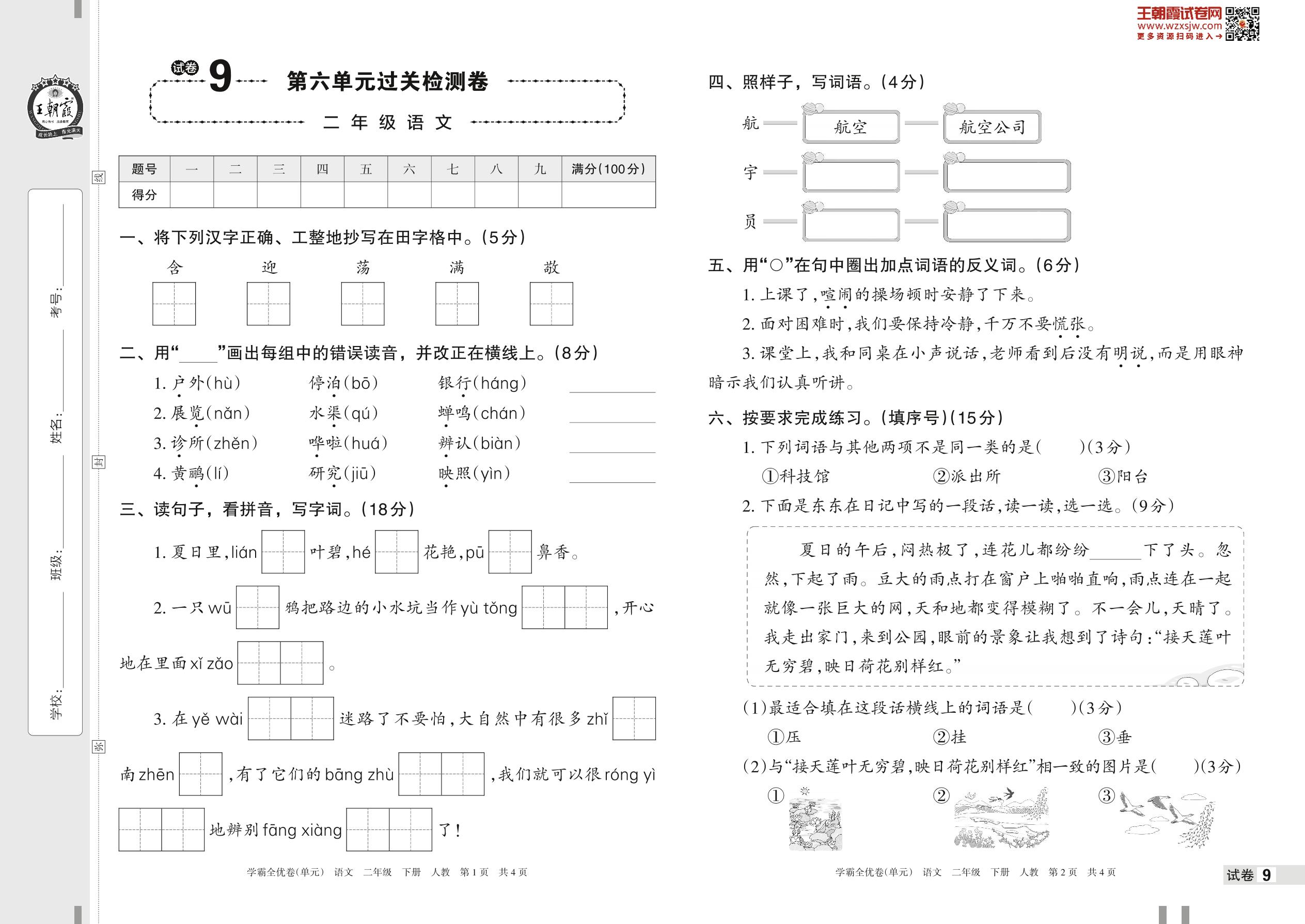 2023下册二年级语文人教版 试卷9 第六单元过关检测卷
