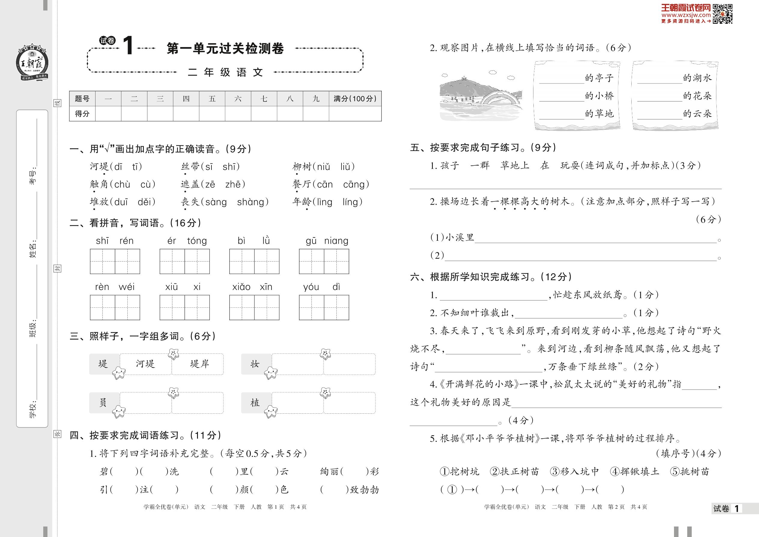 2023下册二年级语文人教版 试卷1 第一单元过关检测卷