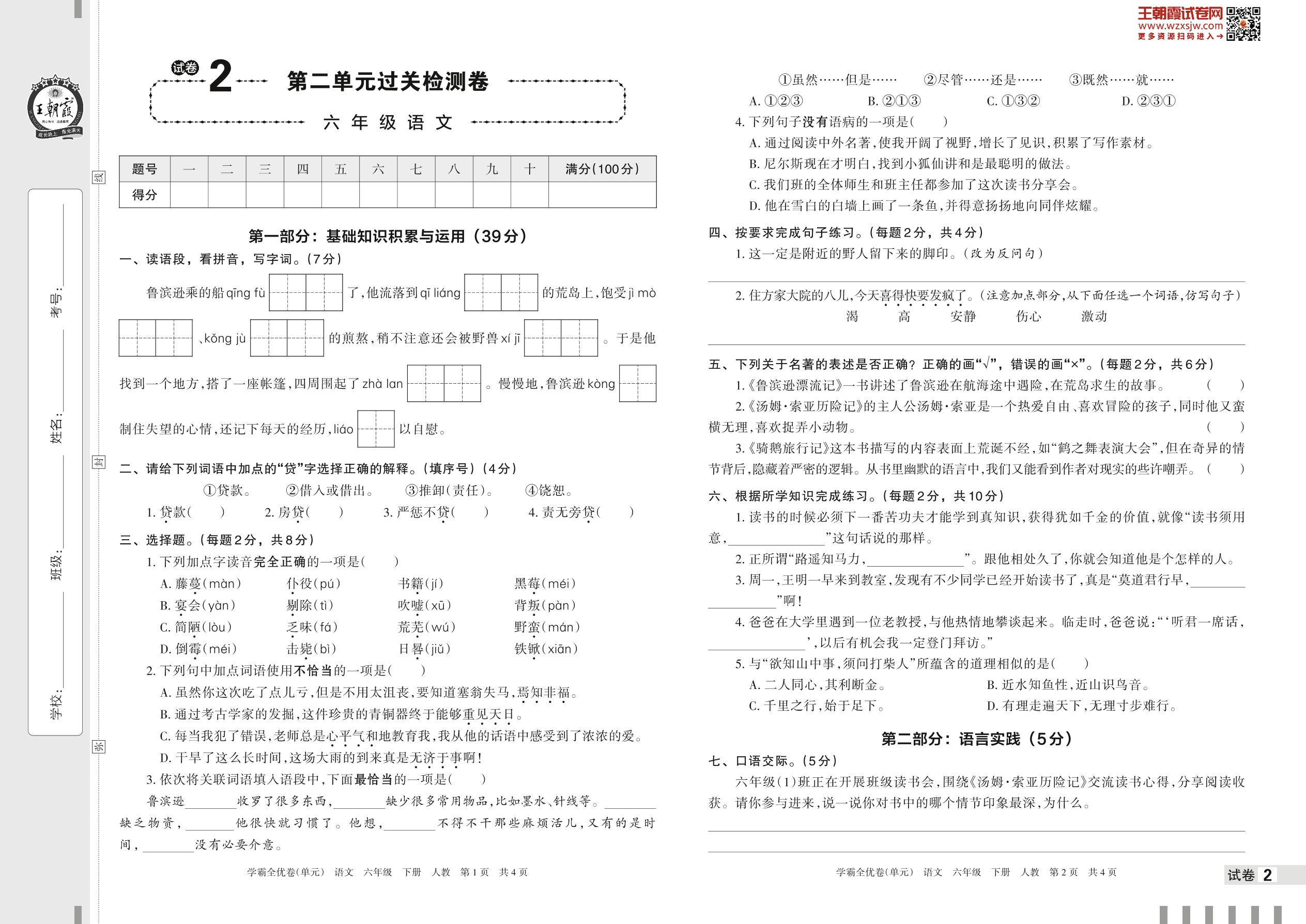 2023下册六年级语文人教版 试卷2 第二单元过关检测卷