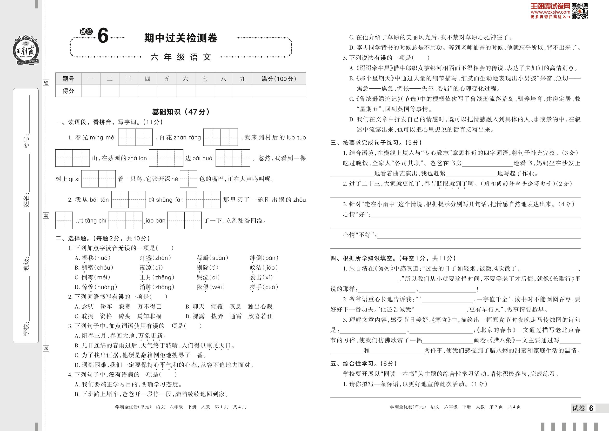 2023下册六年级语文人教版 试卷6 期中过关检测卷