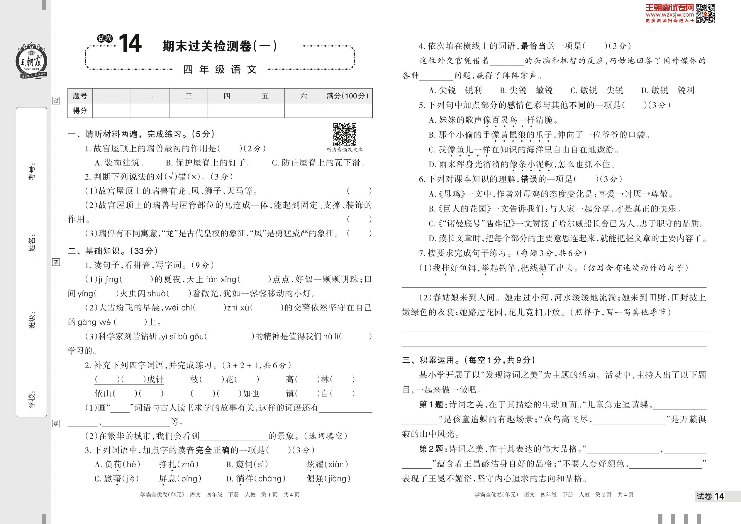 2023下册四年级语文人教版 试卷14 期末过关检测卷(一)