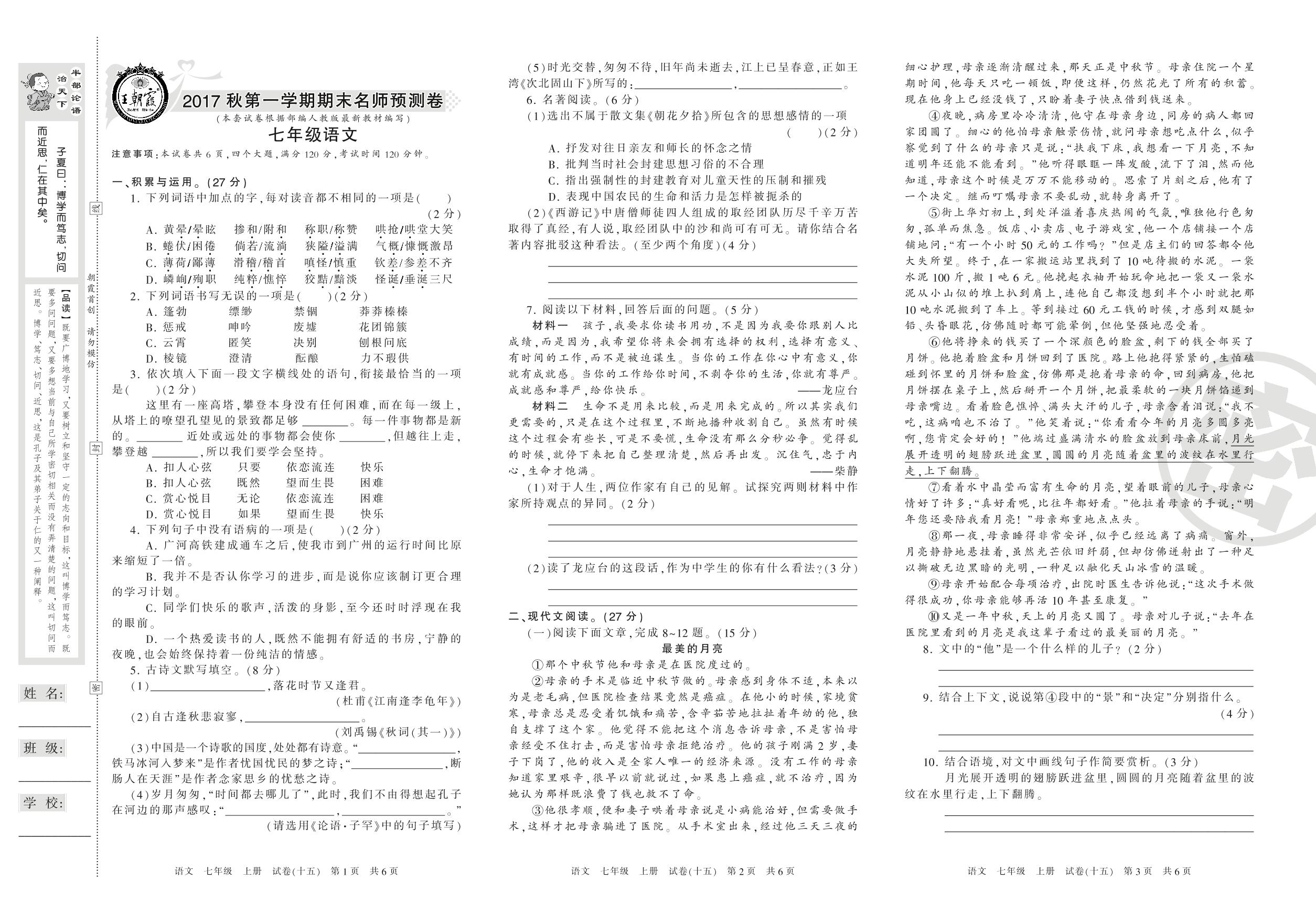 王朝霞名师期末预测卷七年级上册语文(人教版)【15】