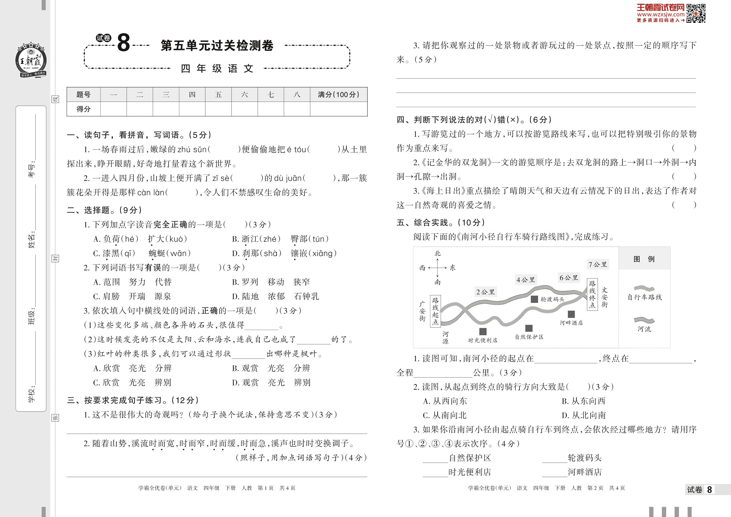 2023下册四年级语文人教版 试卷8 第五单元过关检测卷