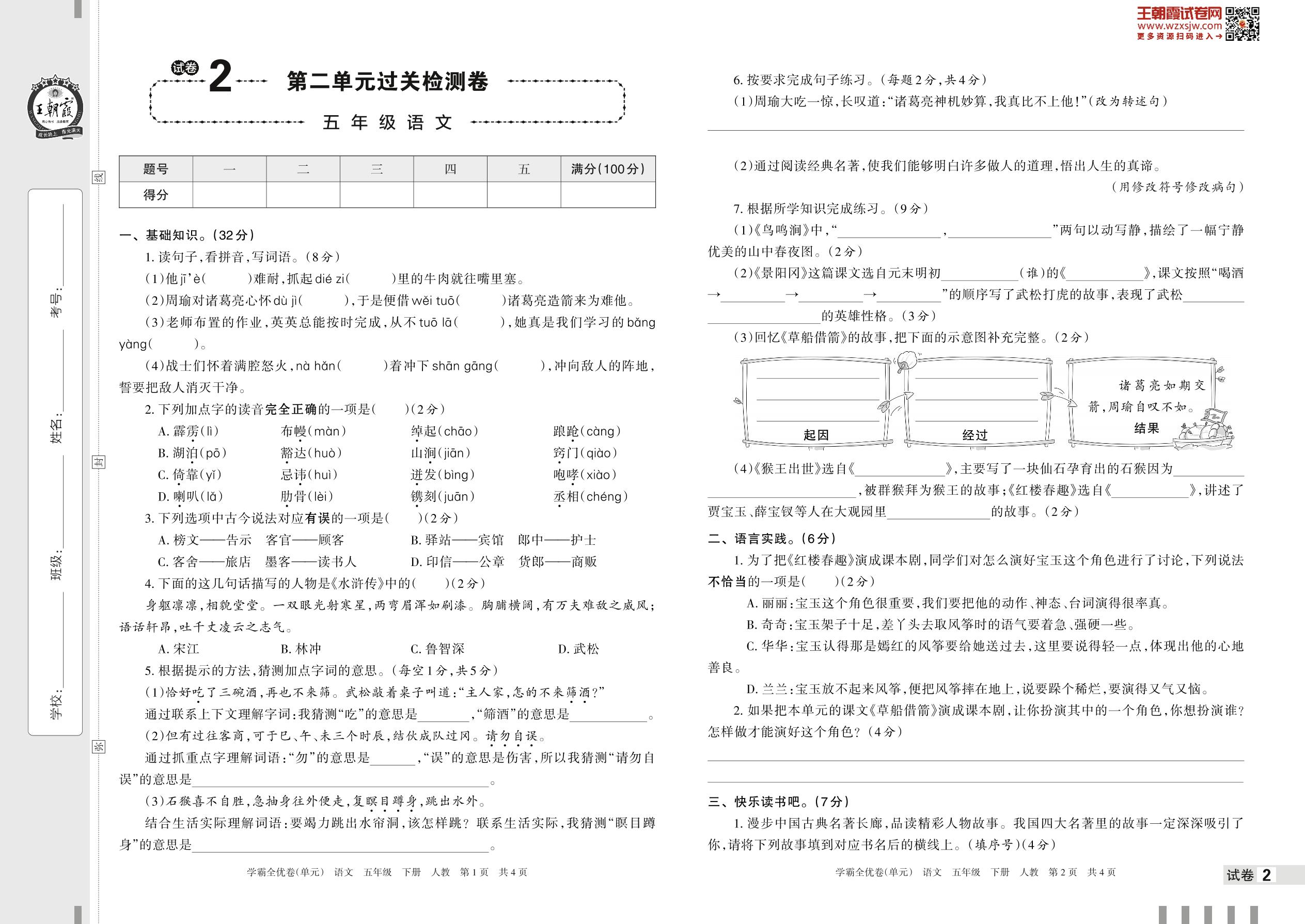 2023下册五年级语文人教版 试卷2 第二单元过关检测卷