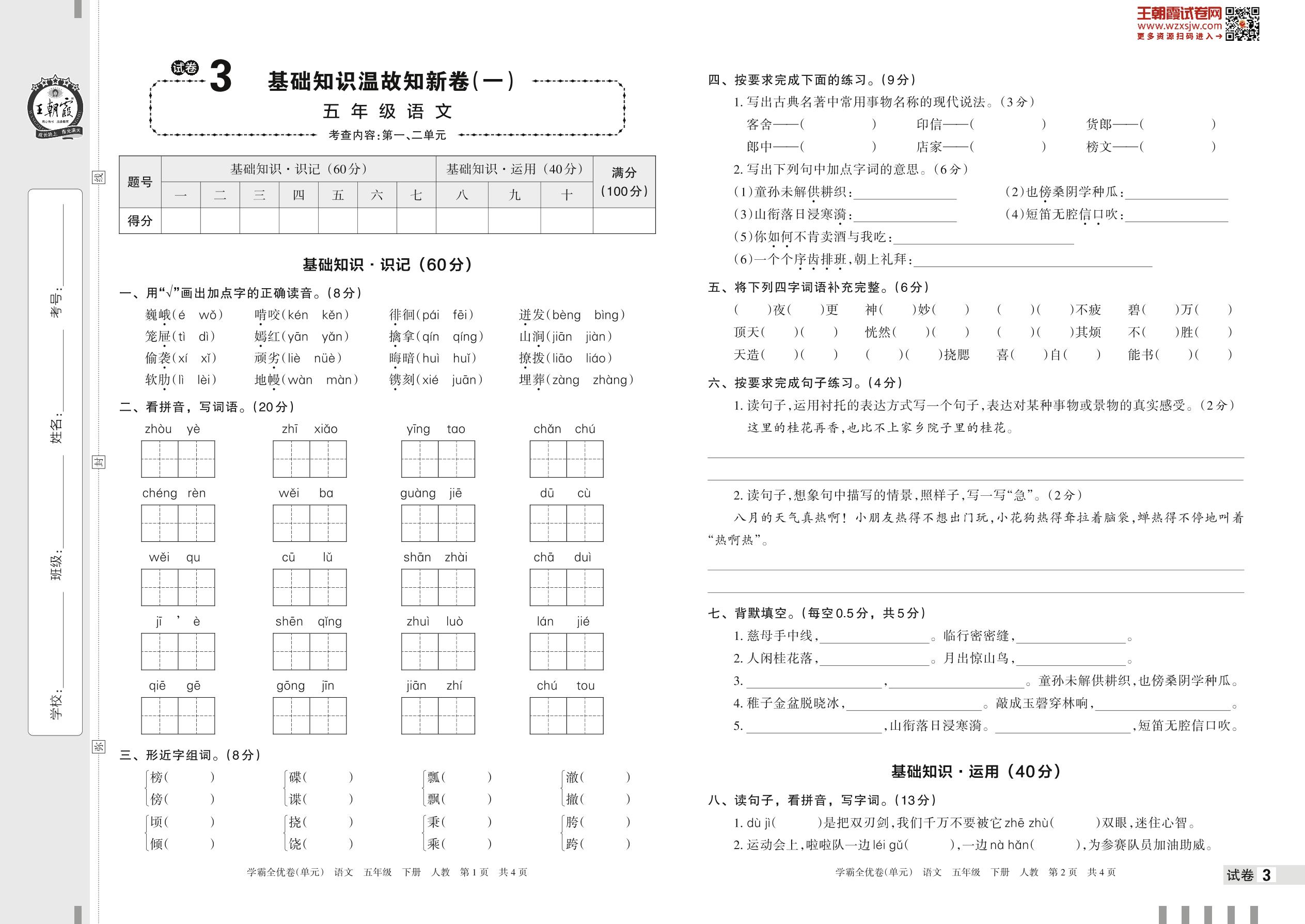 2023下册五年级语文人教版 试卷3 基础知识温故知新卷(一)