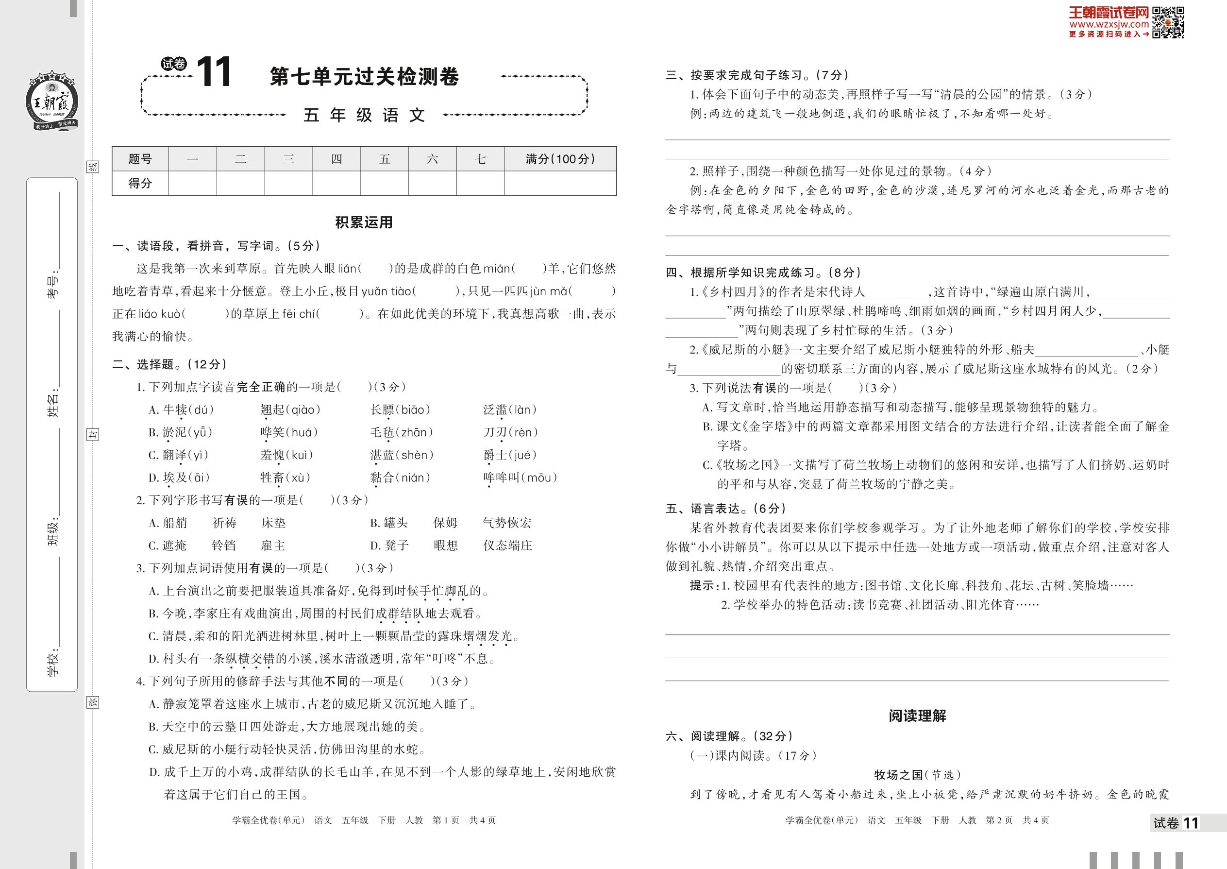 2023下册五年级语文人教版 试卷11 第七单元过关检测卷