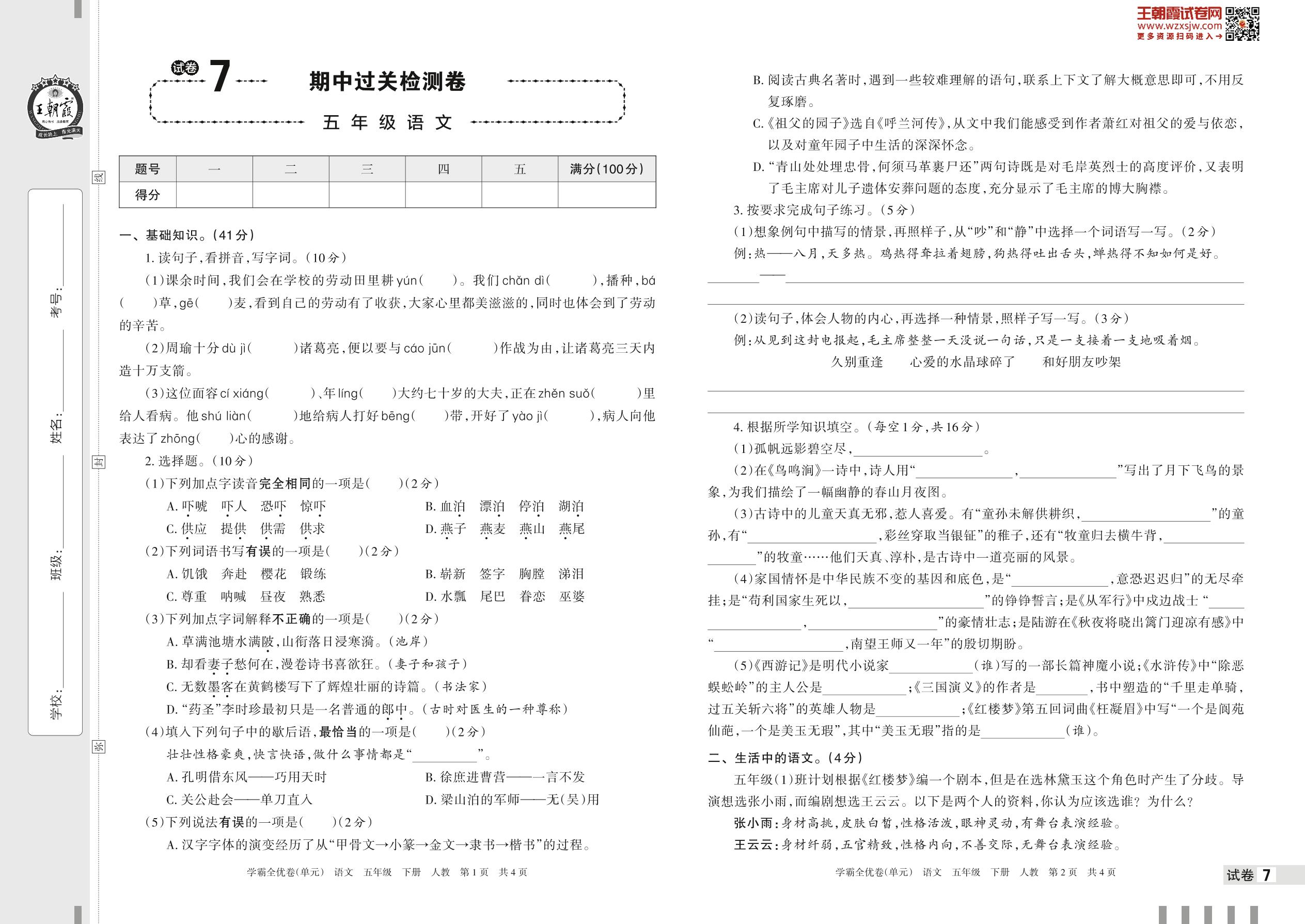 2023下册五年级语文人教版 试卷7 期中过关检测卷