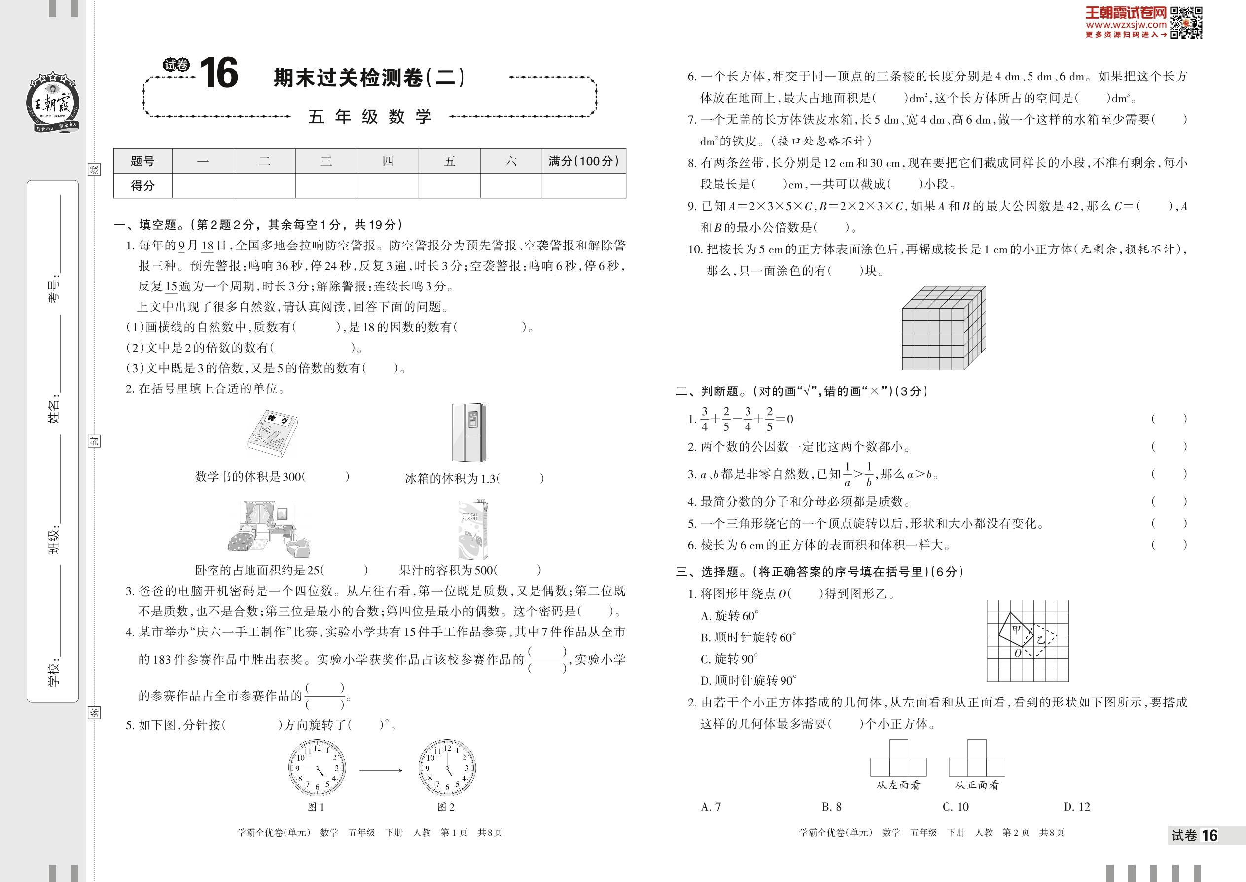 2023下册五年级数学人教版 试卷16 期末过关检测卷(二)