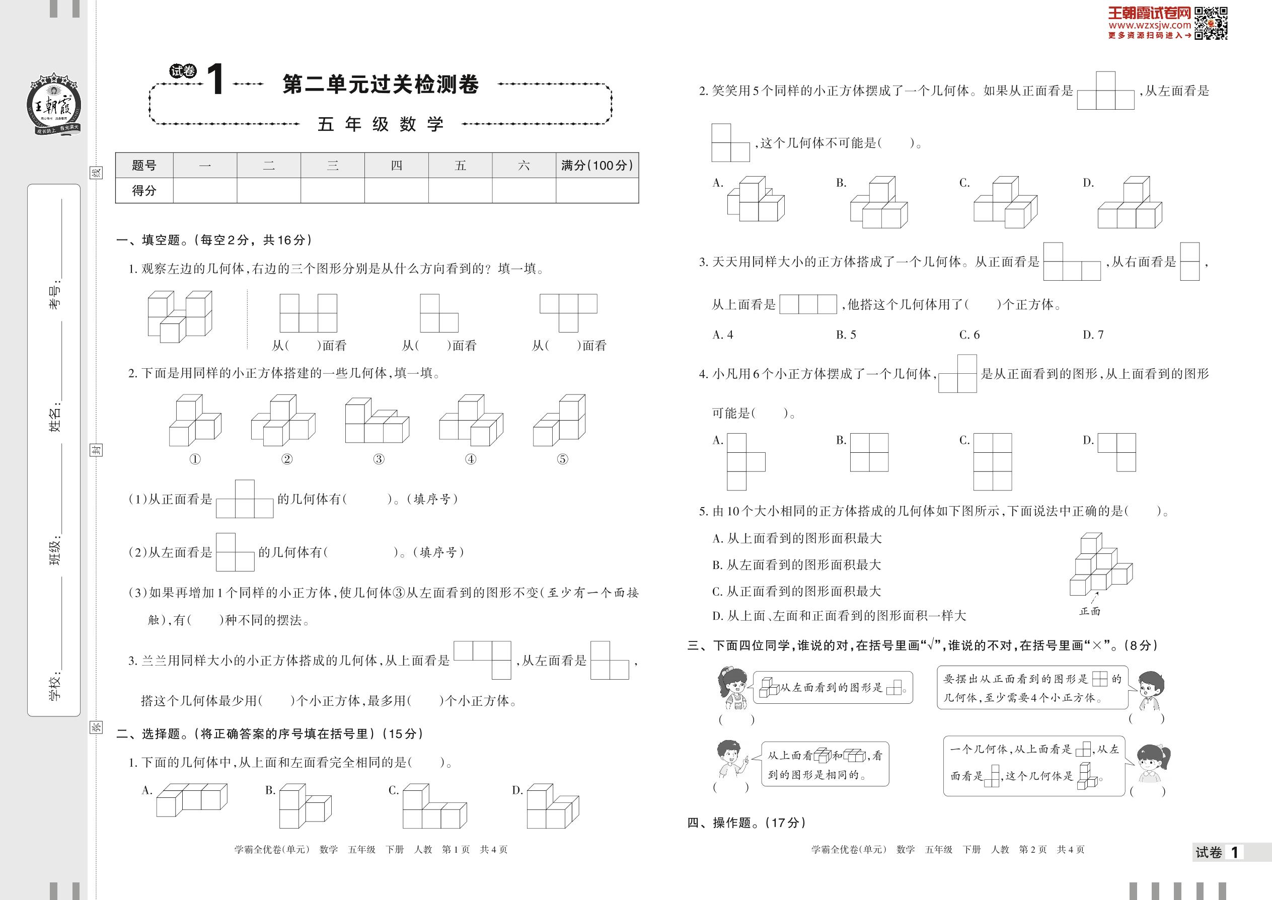 2023下册五年级数学人教版 试卷1 第一单元过关检测卷