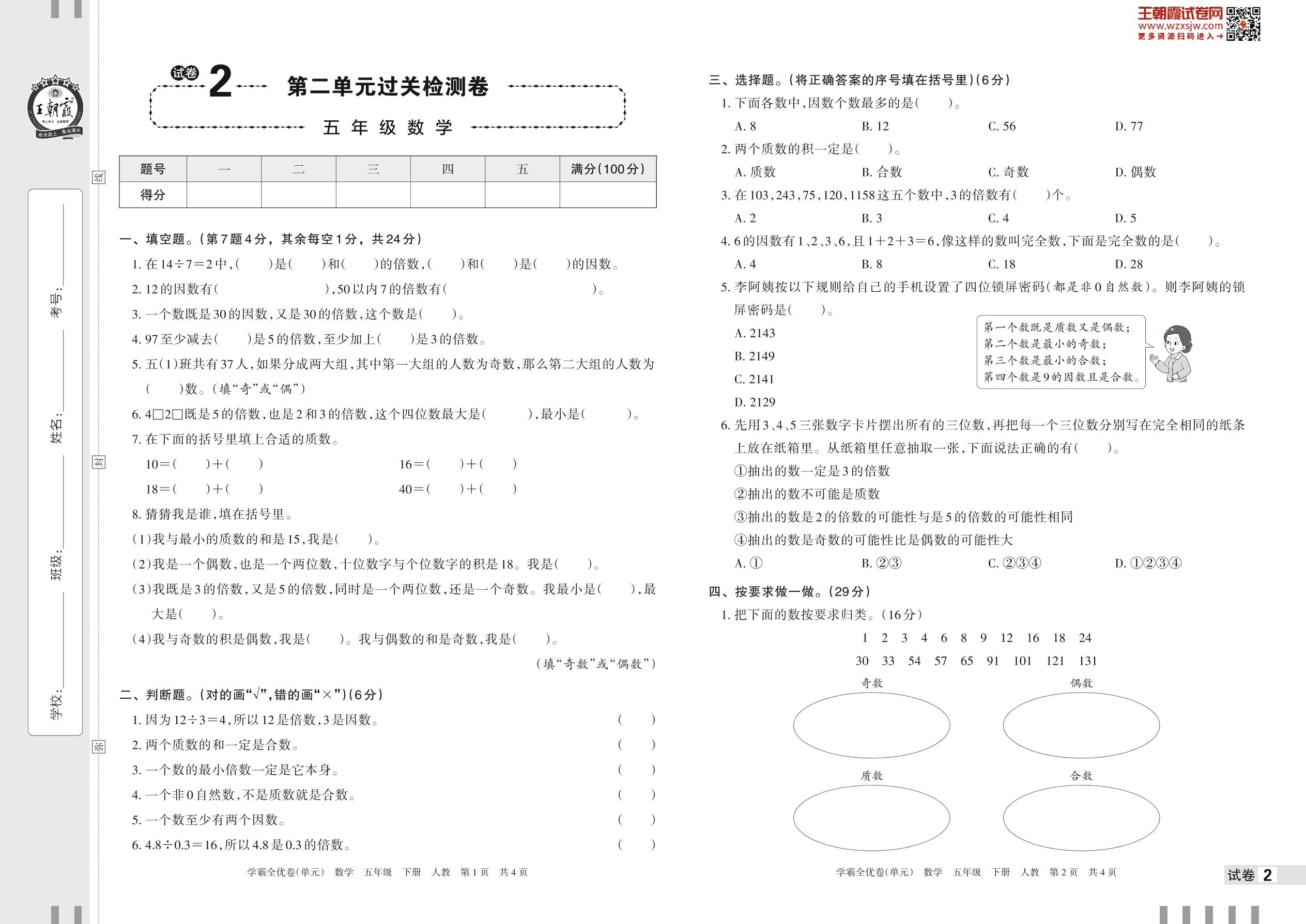 2023下册五年级数学人教版 试卷2 第二单元过关检测卷