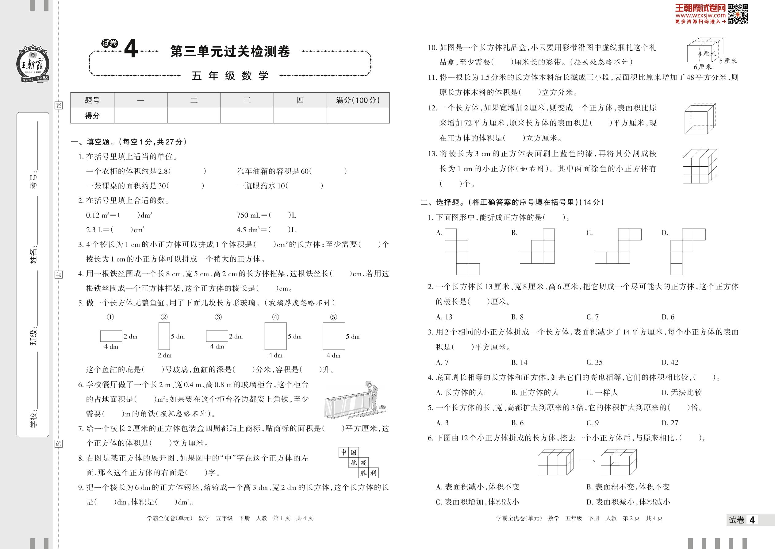2023下册五年级数学人教版 试卷4 第三单元过关检测卷