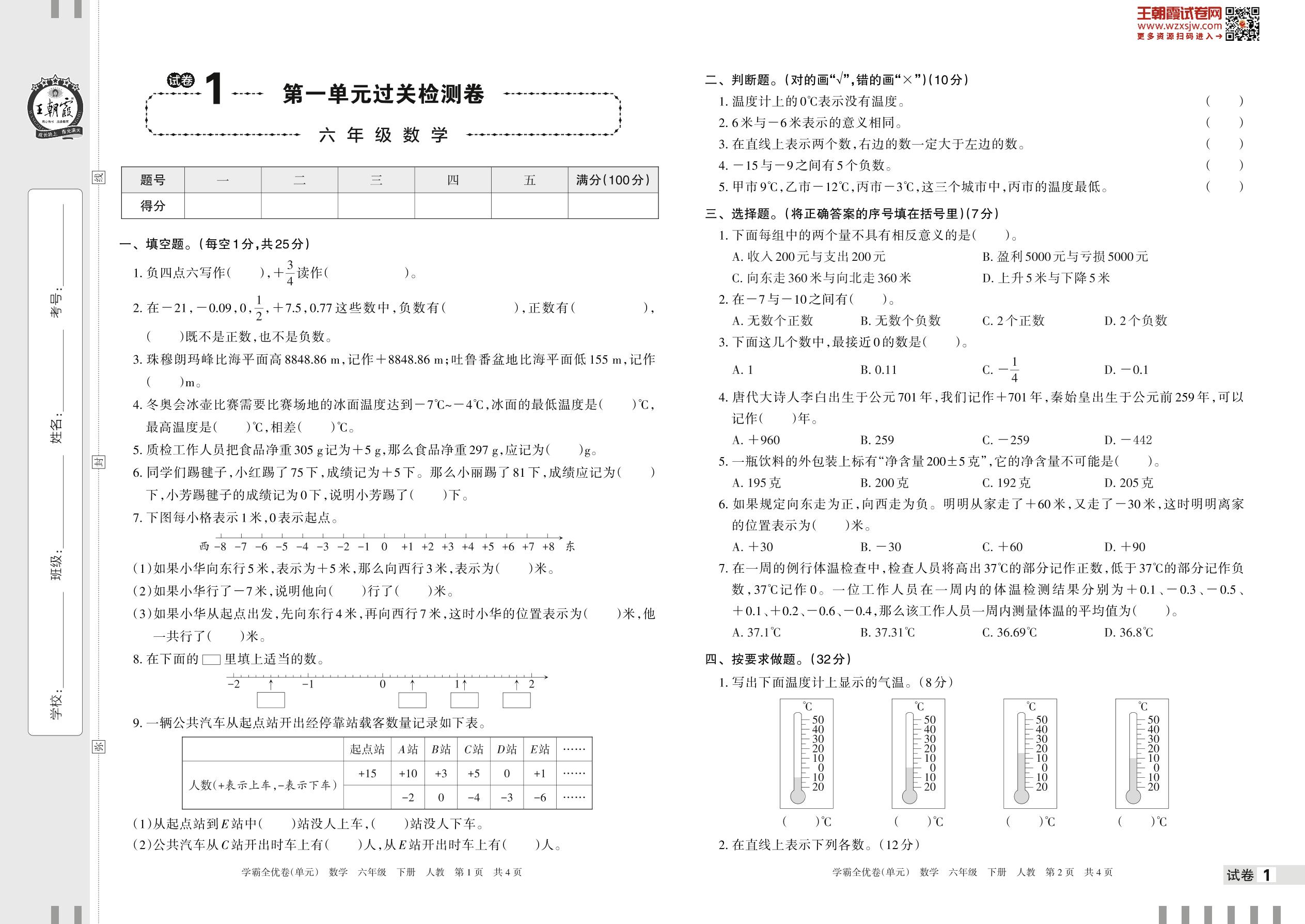 2023下册六年级数学人教版 试卷1 第一单元过关检测卷