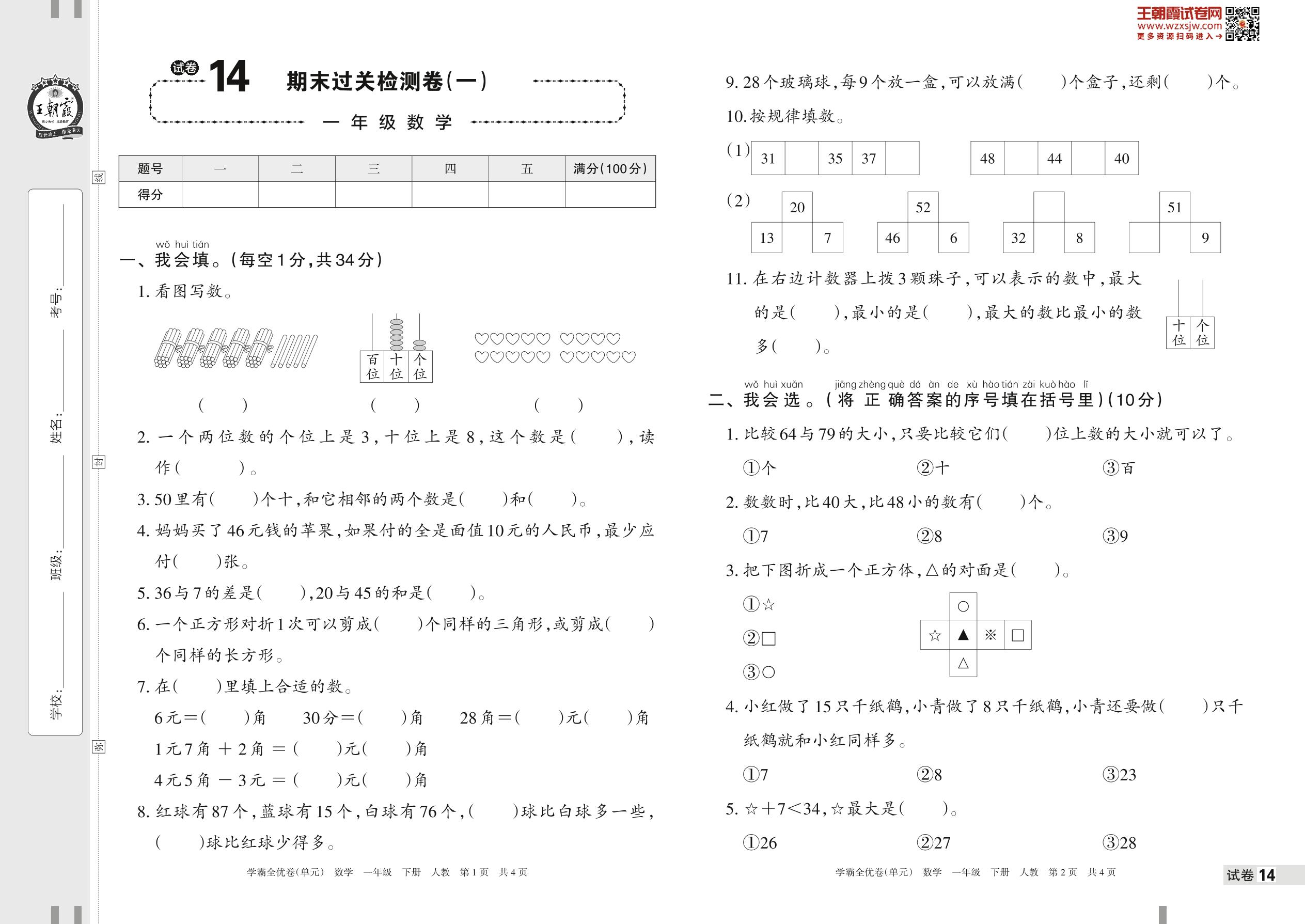 2023下册一年级数学人教版 试卷14 期末过关检测卷(一)
