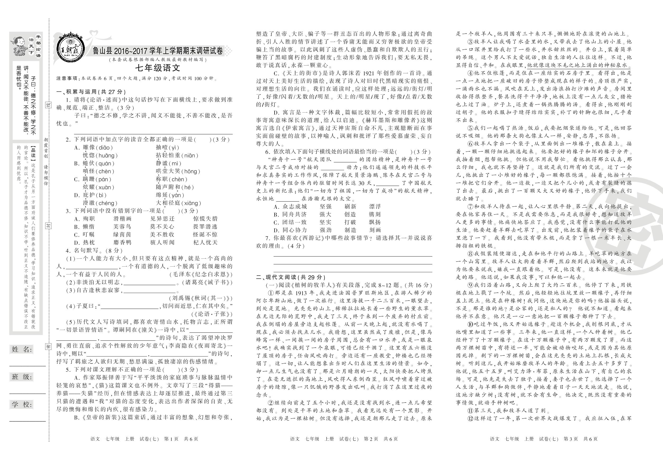 2016-2017学年第一学期平顶山市鲁山县七年级语文试卷(人教版)【7】