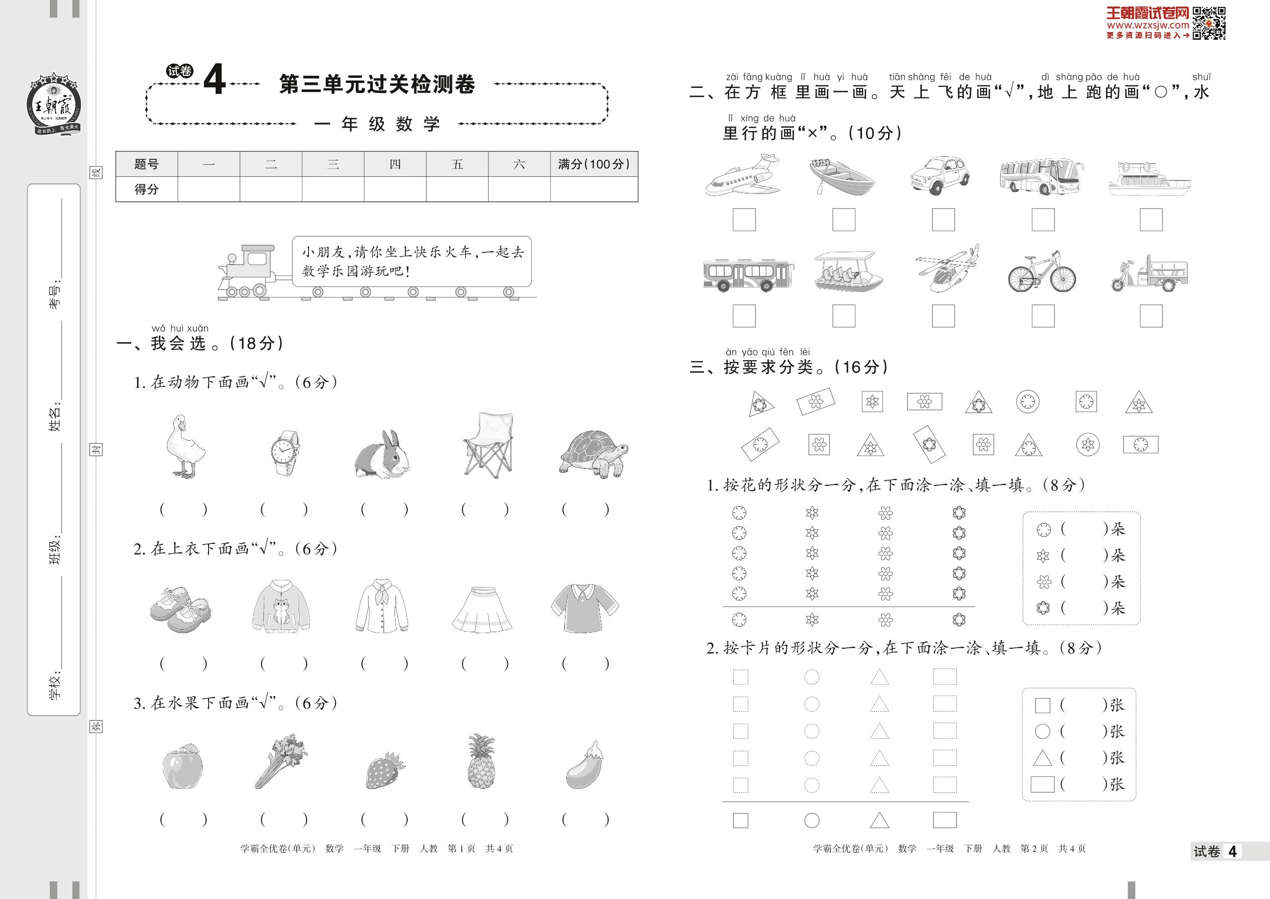 2023下册一年级数学人教版 试卷4 第三单元过关检测卷