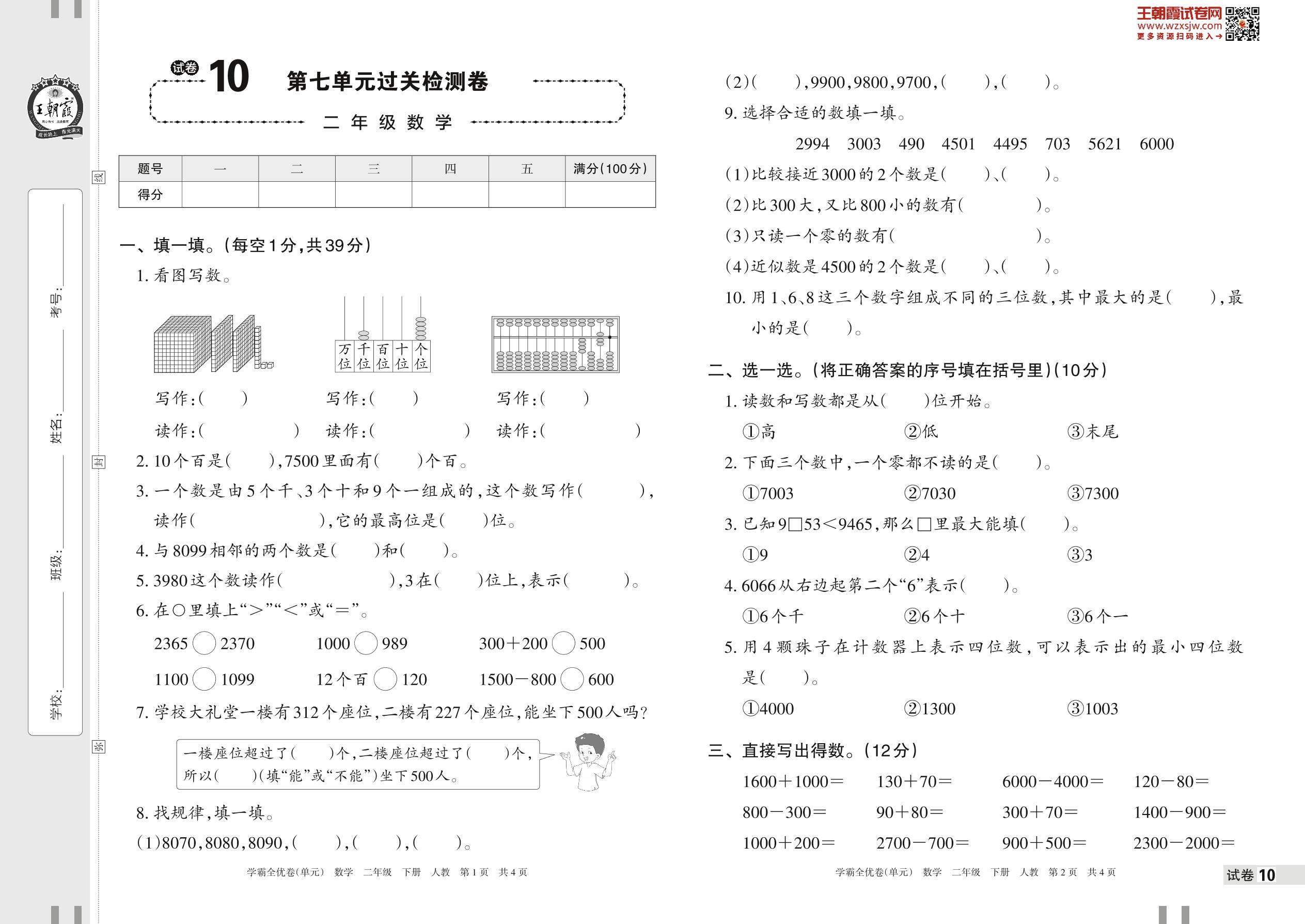 2023下册二年级数学人教版 试卷10 第七单元过关检测卷