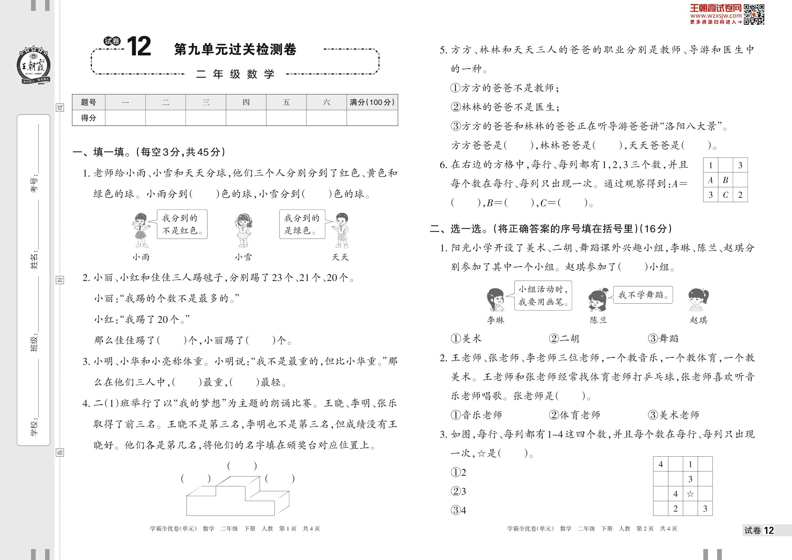 2023下册二年级数学人教版 试卷12 第九单元过关检测卷