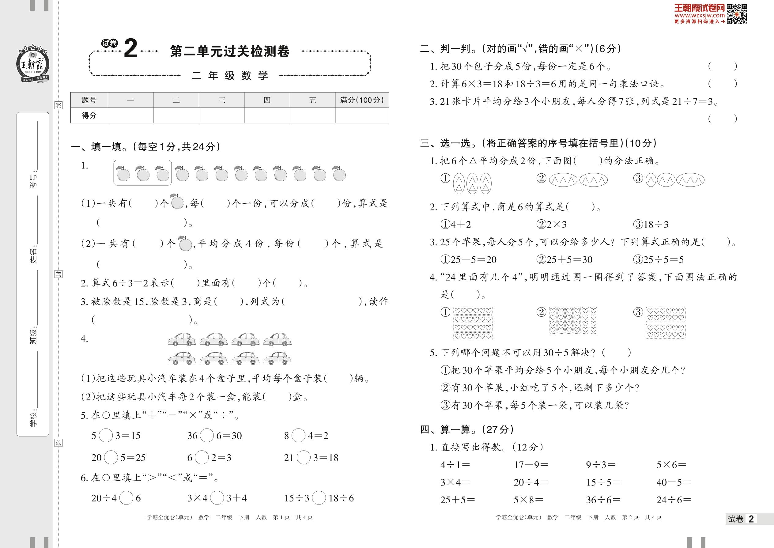 2023下册二年级数学人教版 试卷2 第二单元过关检测卷