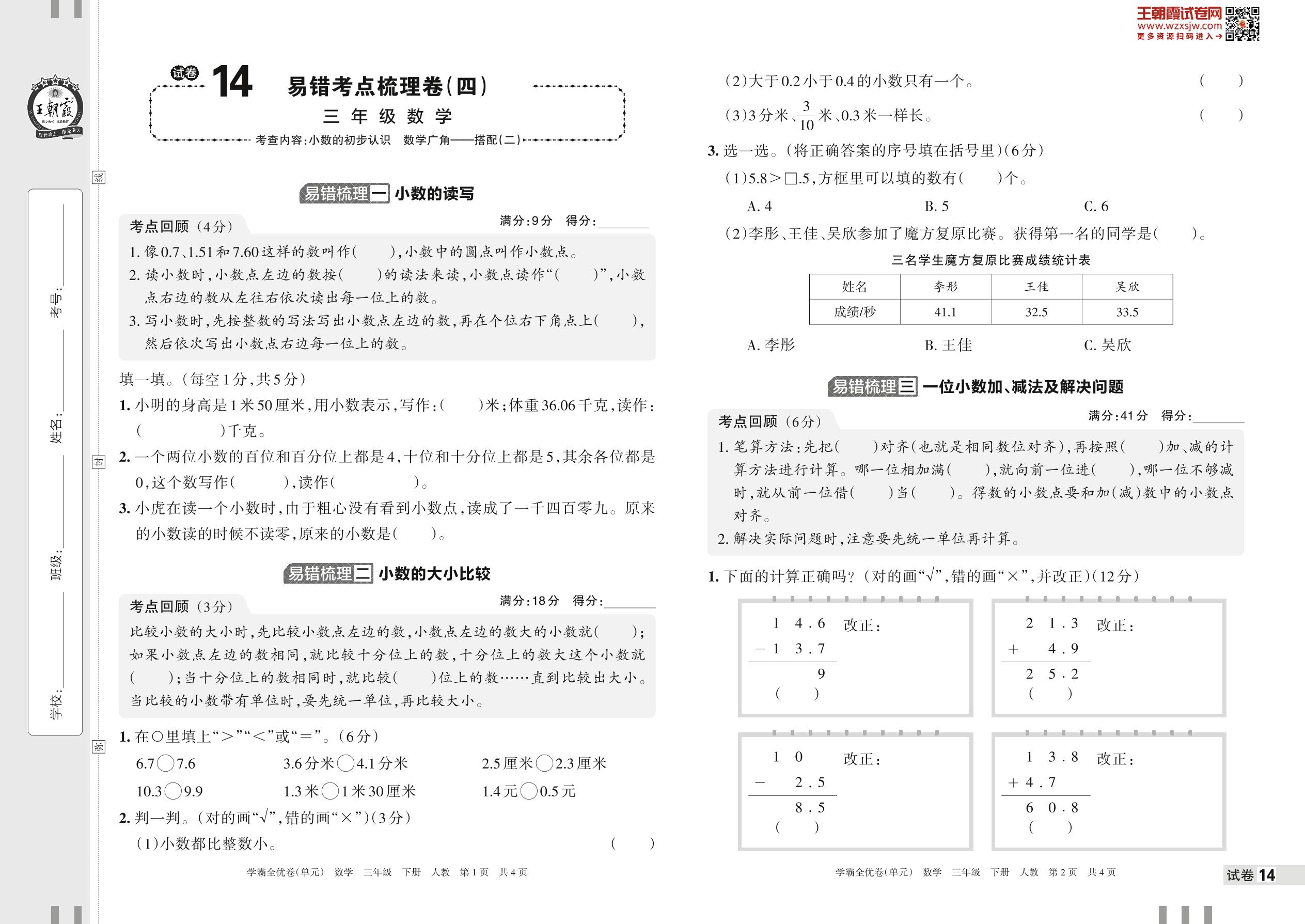 2023下册三年级数学人教版 试卷14 易错考点梳理卷(四)