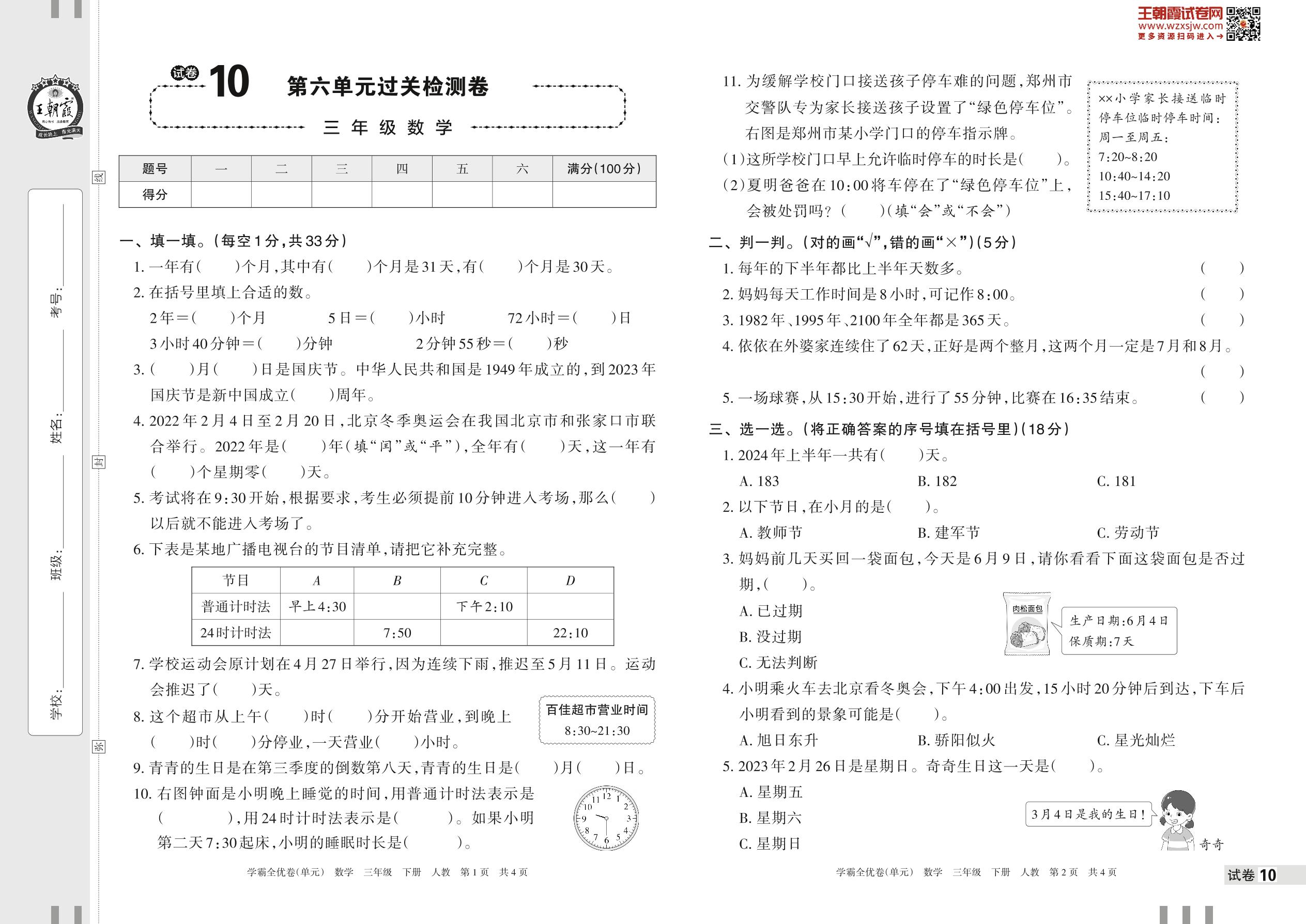2023下册三年级数学人教版 试卷10 第六单元过关检测卷