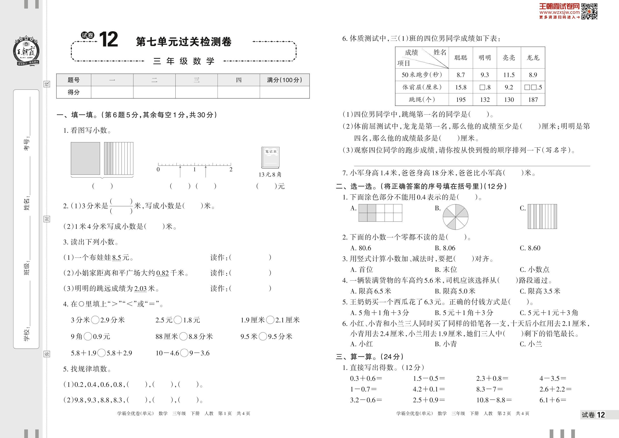 2023下册三年级数学人教版 试卷12 第七单元过关检测卷