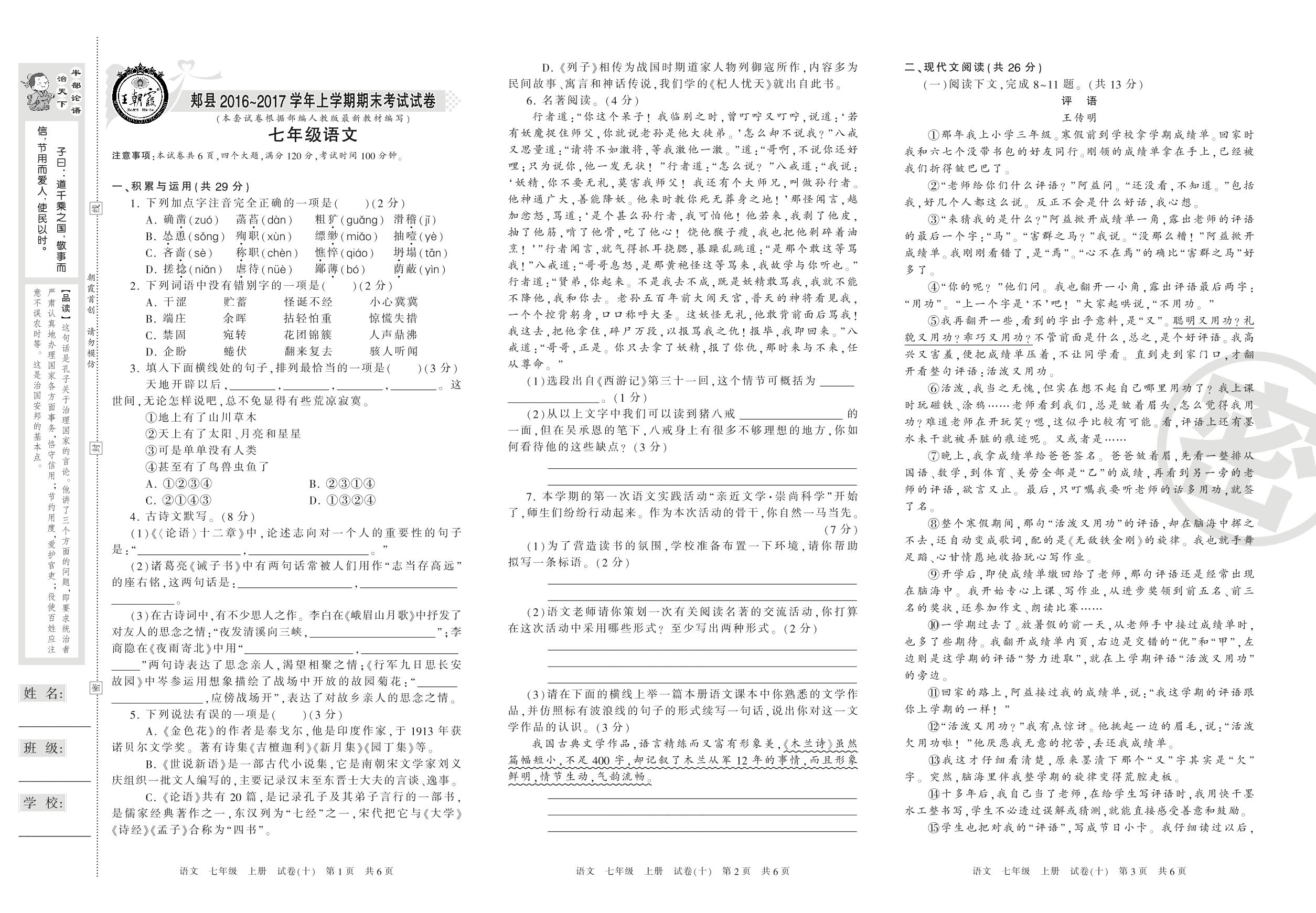 2016-2017学年第一学期平顶山市郏县七年级语文试卷(人教版)【10】