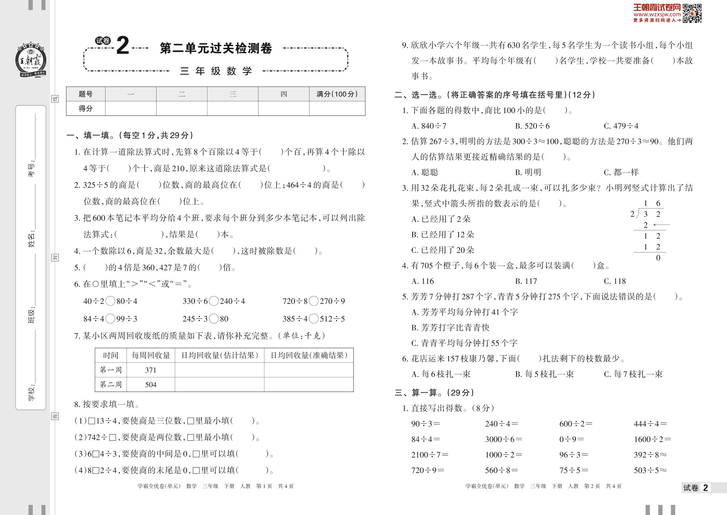 2023下册三年级数学人教版 试卷2 第二单元过关检测卷