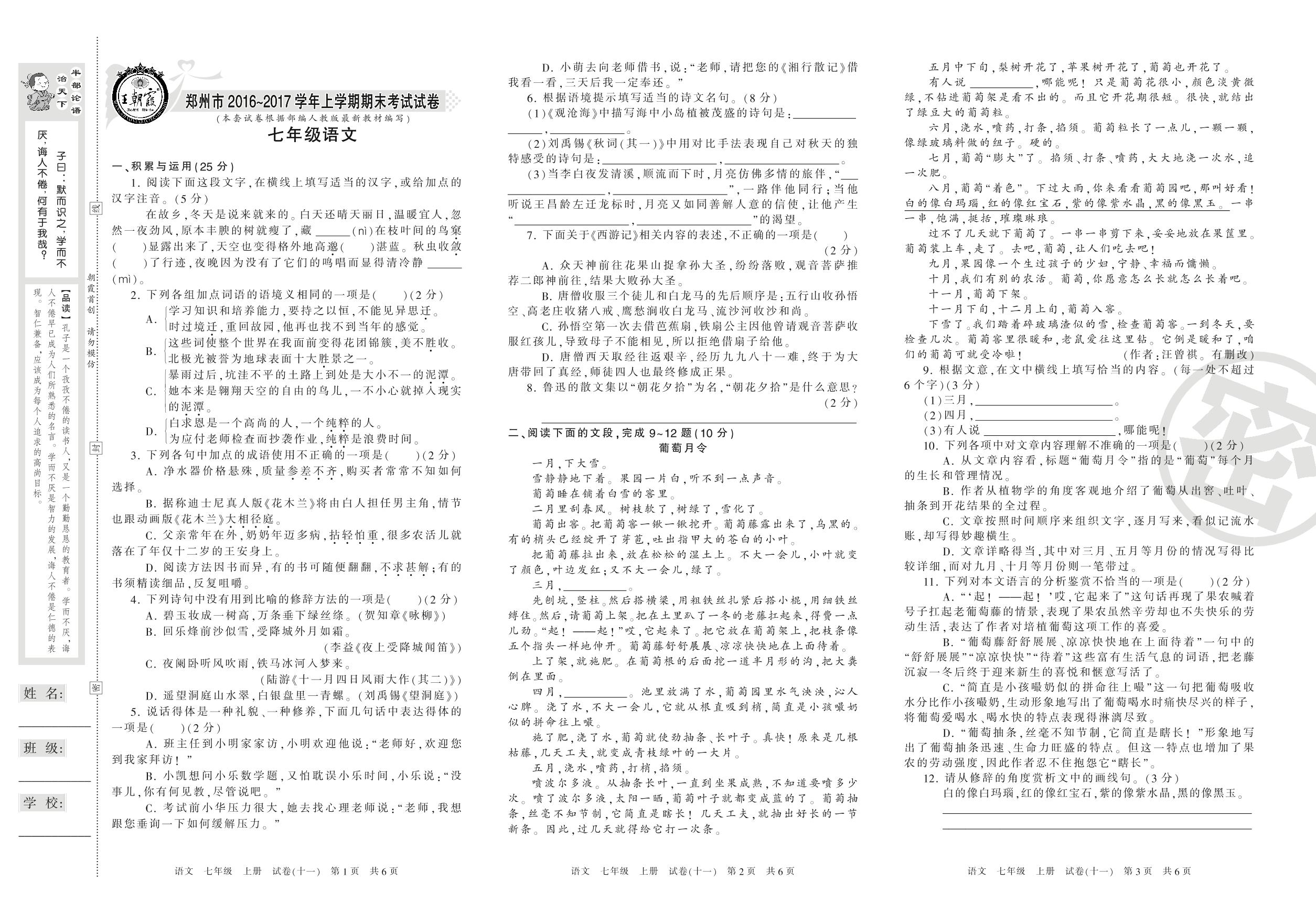 2016-2017学年第一学期郑州市七年级语文试卷(人教版)【11】