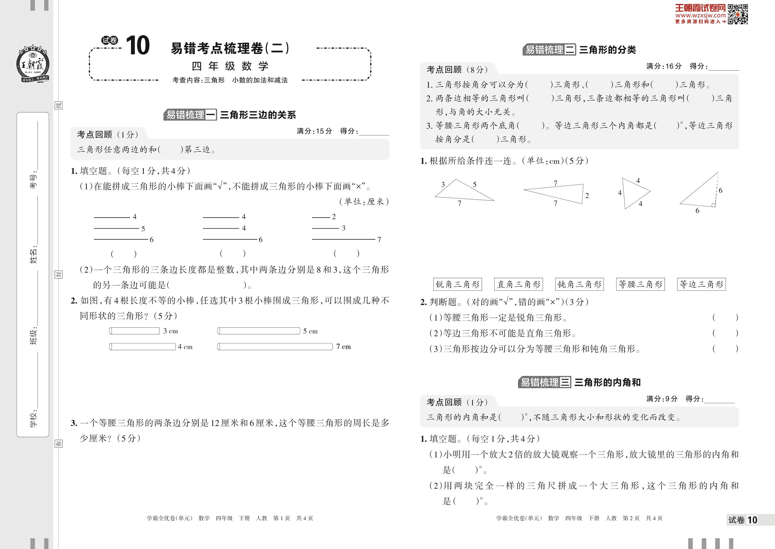 2023下册四年级数学人教版 试卷10 易错考点梳理卷(二)