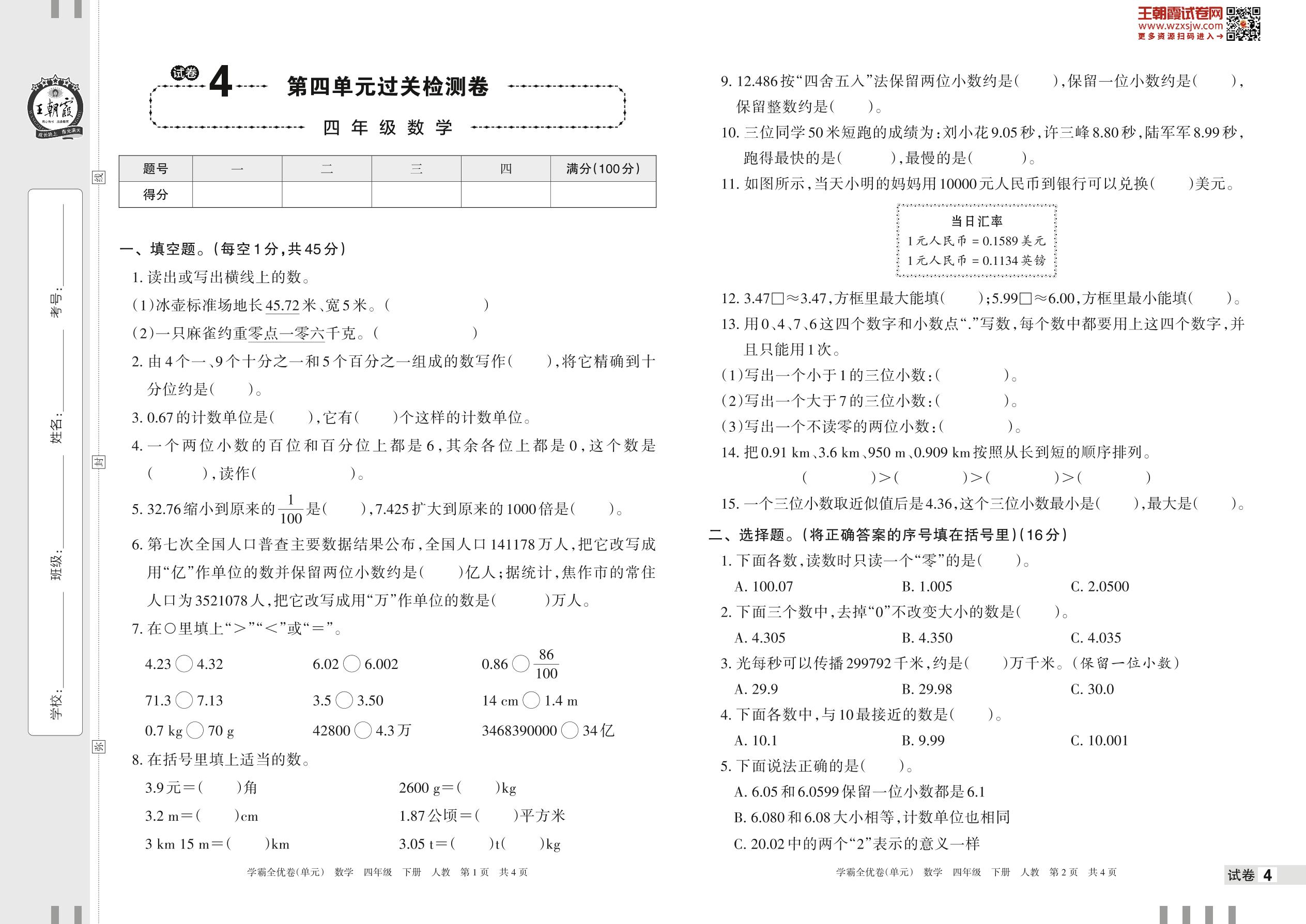 2023下册四年级数学人教版 试卷4 第四单元过关检测卷