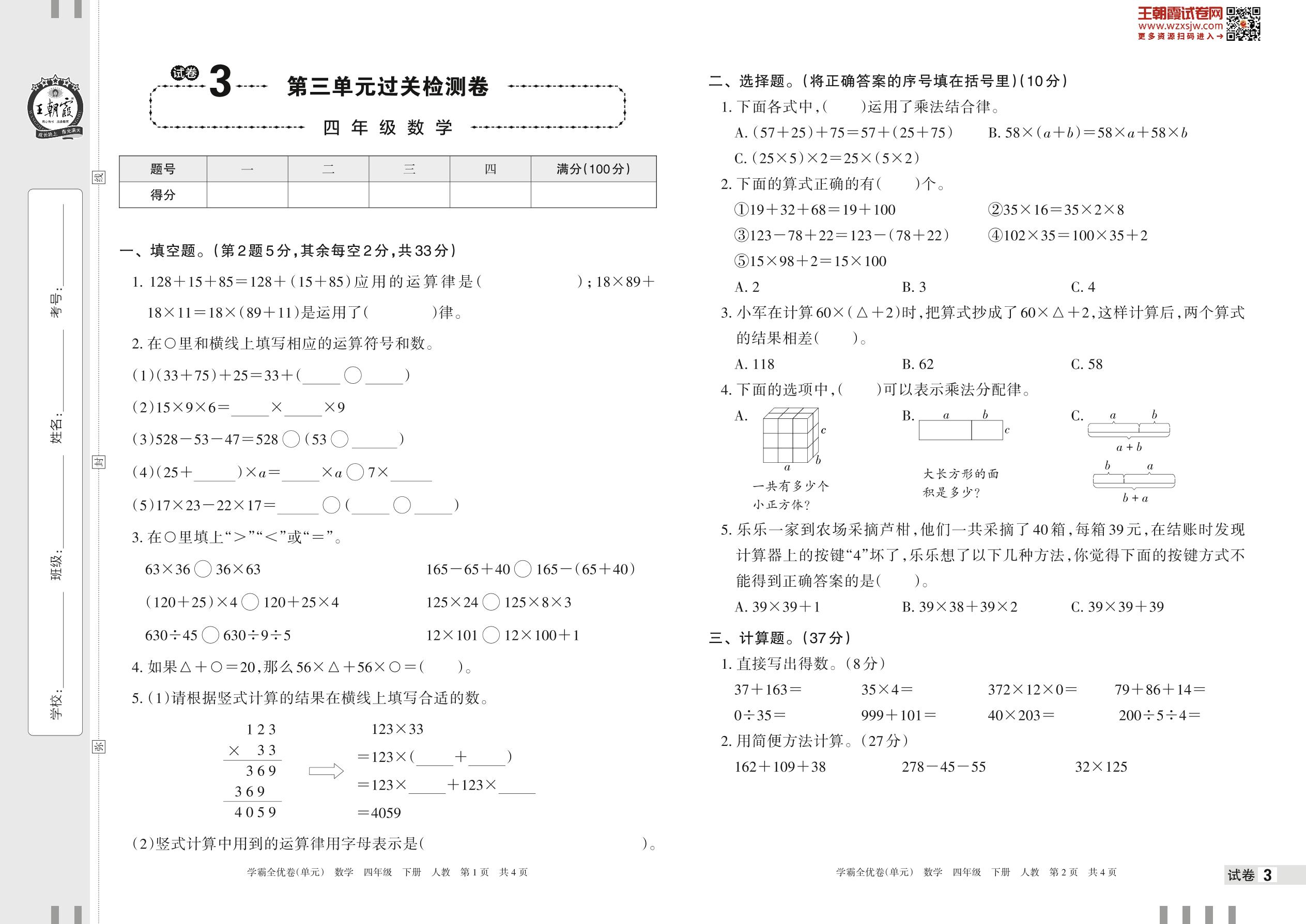 2023下册四年级数学人教版 试卷3 第三单元过关检测卷