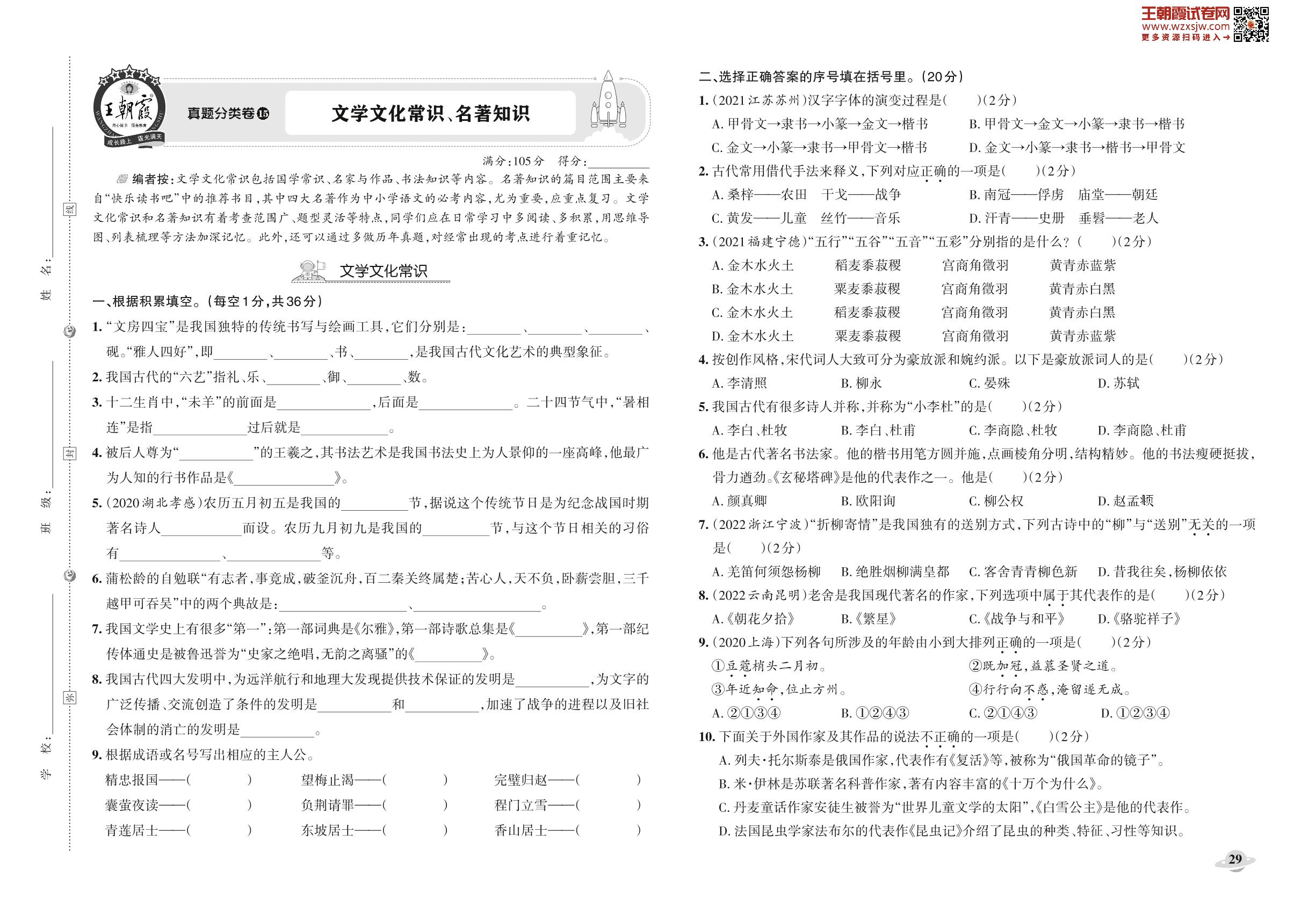 小升初语文真题分类·王朝霞精编卷——文学文化常识、名著知识【15】