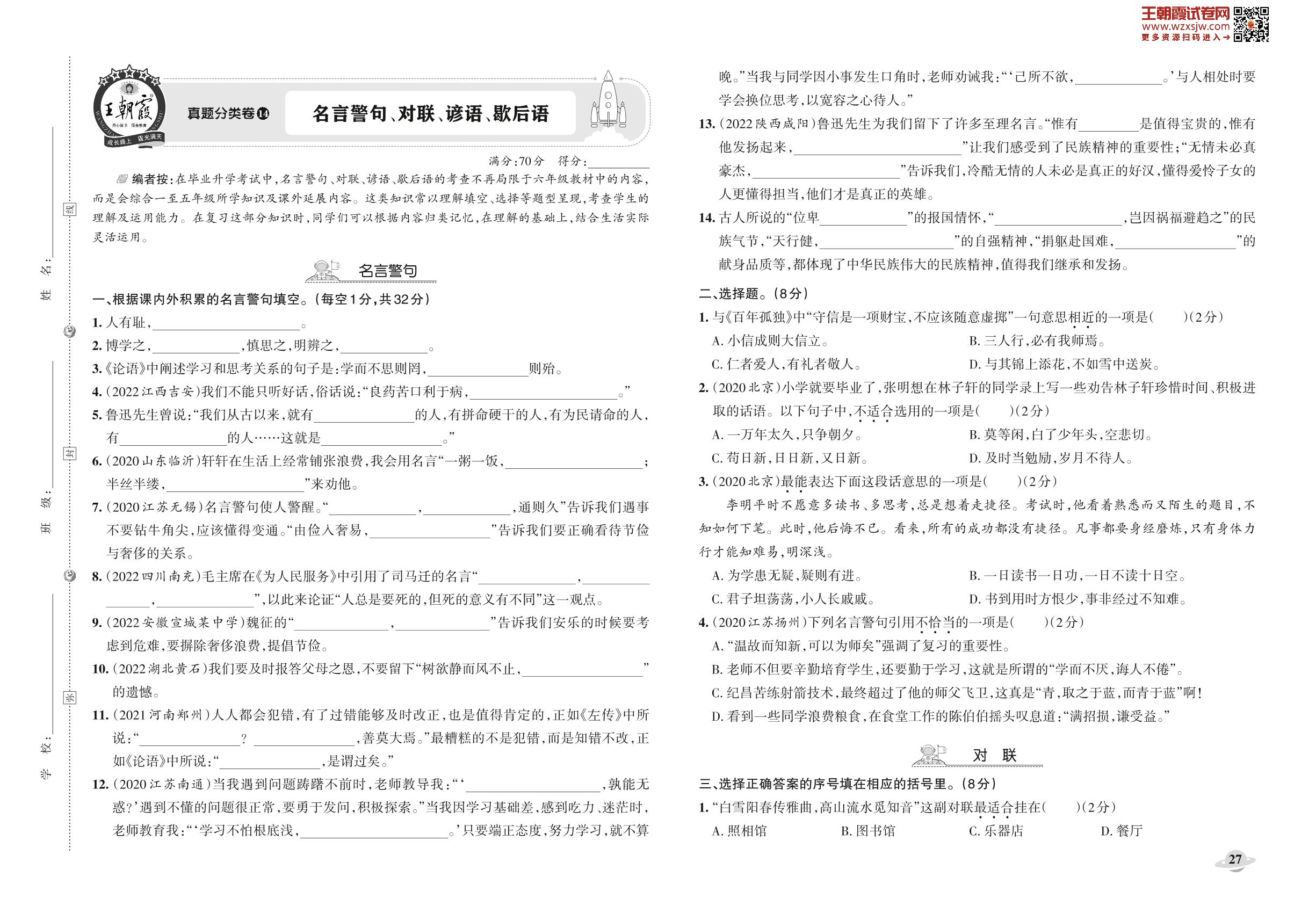 小升初语文真题分类·王朝霞精编卷——名言警句、对联、谚语、歇后语【14】