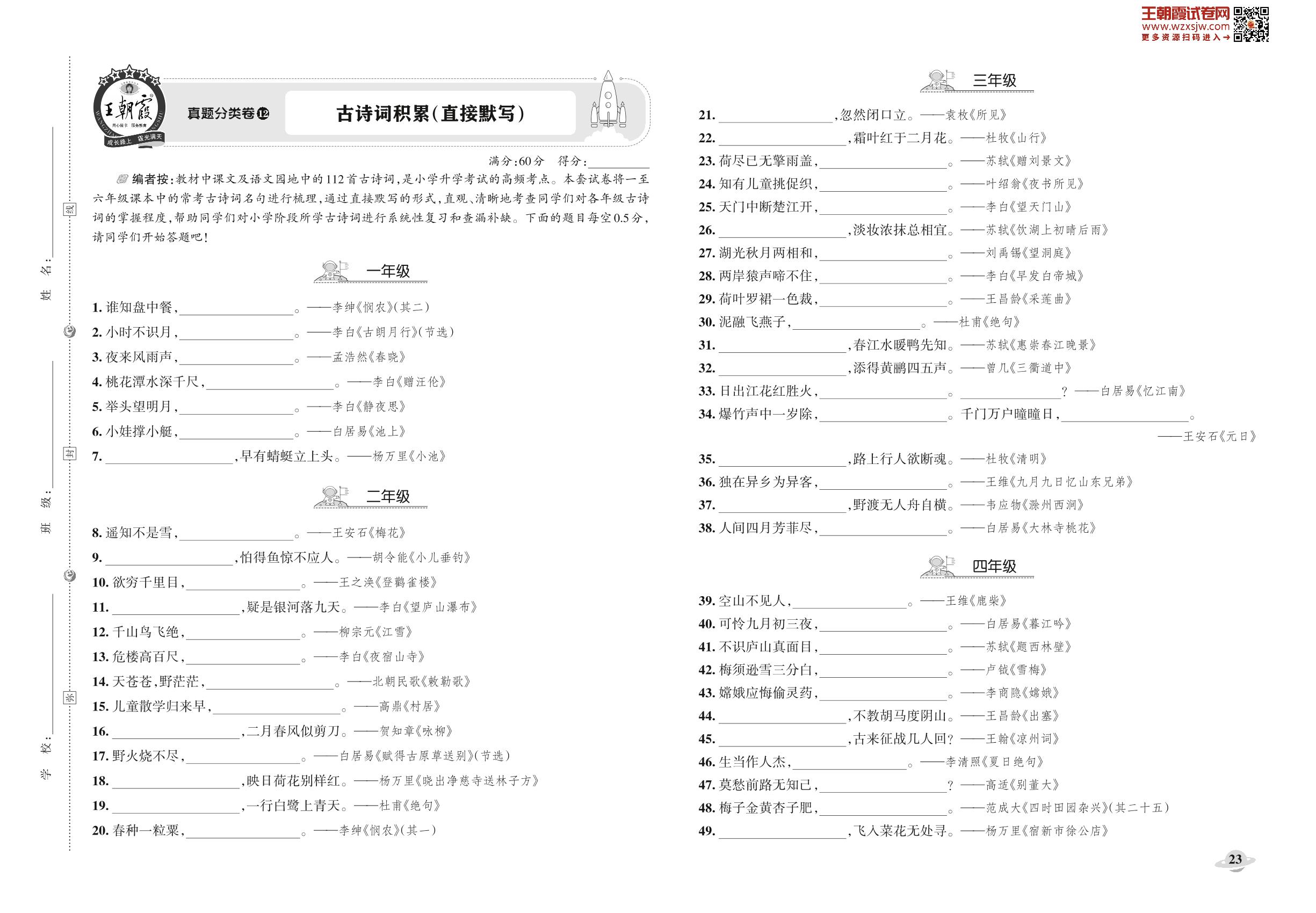 小升初语文真题分类·王朝霞精编卷——古诗词积累(直接默写)【12】