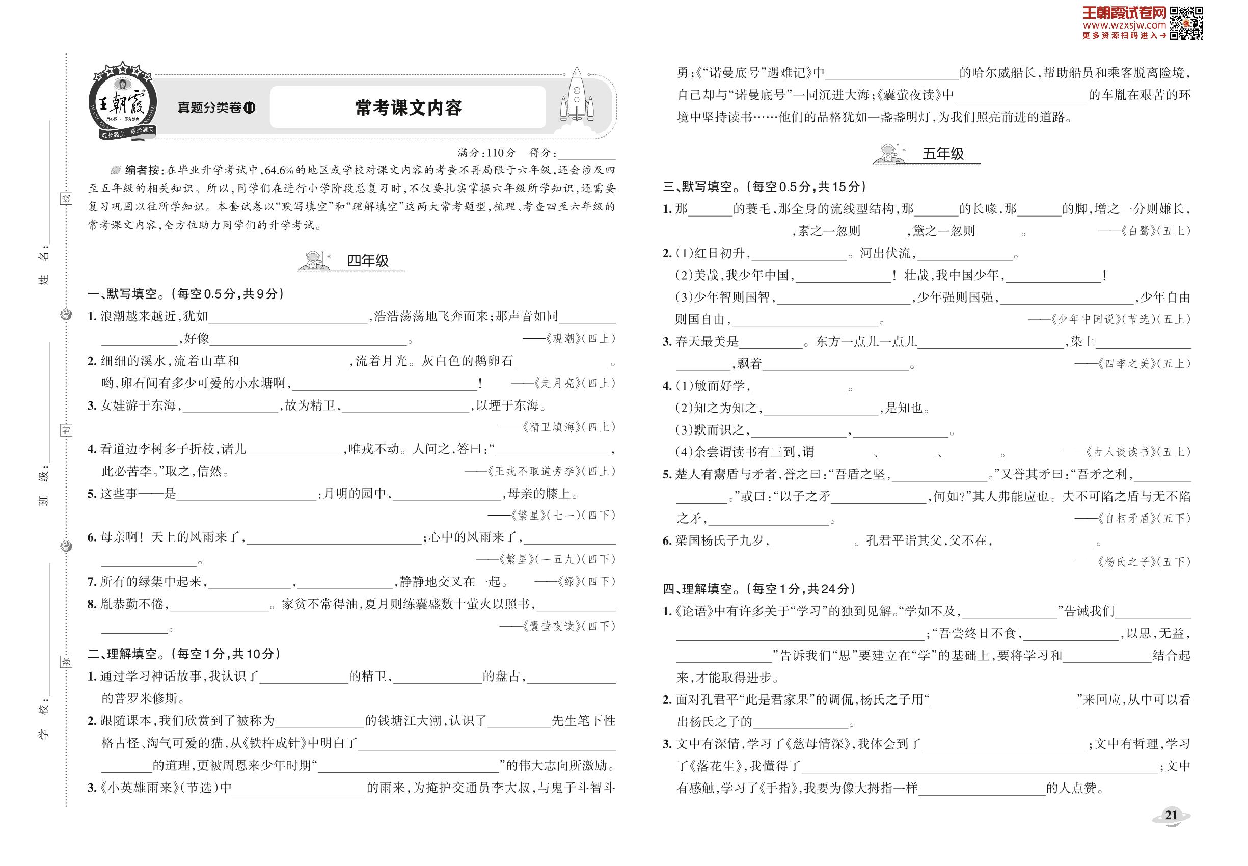 小升初语文真题分类·王朝霞精编卷——常考课文内容【11】