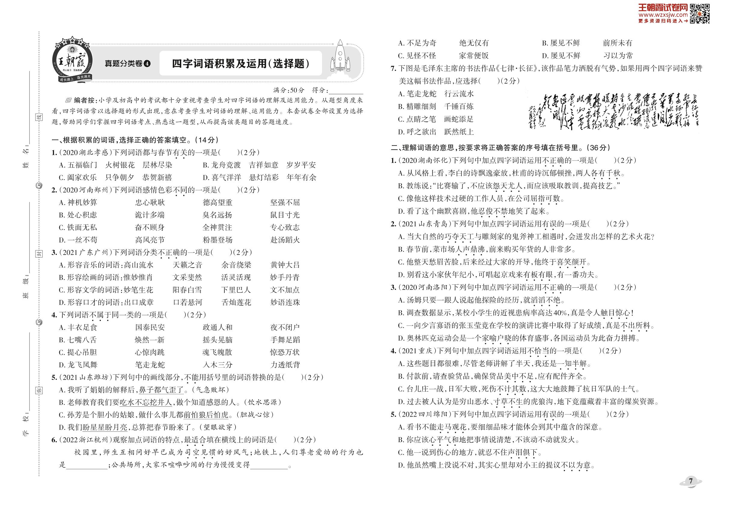 小升初语文真题分类·王朝霞精编卷——四字词语积累及运用(选择题)【4】