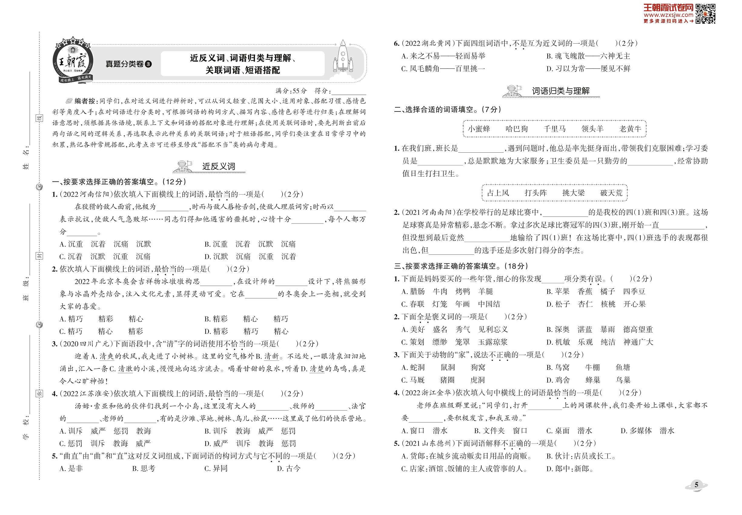 小升初语文真题分类·王朝霞精编卷——近反义词、词语归类与理解、关联词语、短语搭配【3】