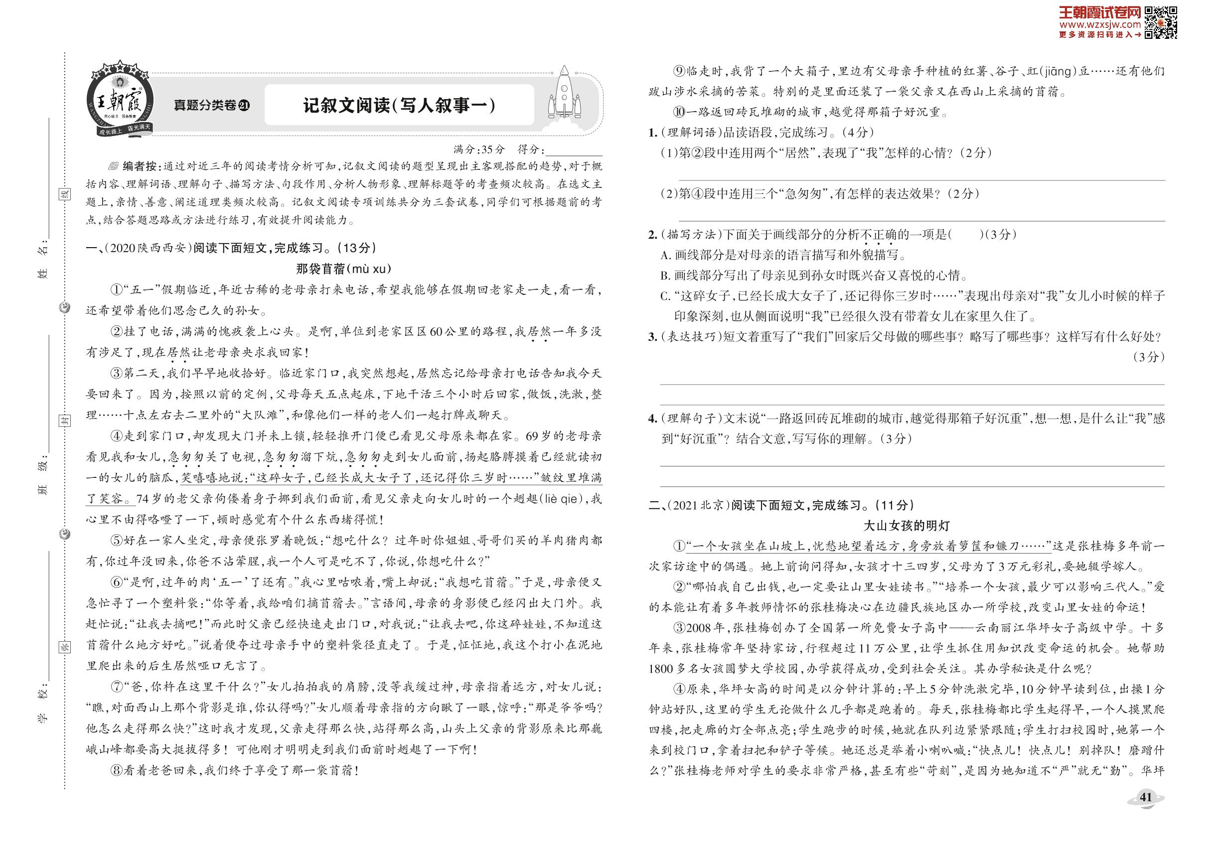 小升初语文真题分类·王朝霞精编卷——记叙文阅读(写人叙事一)【21】