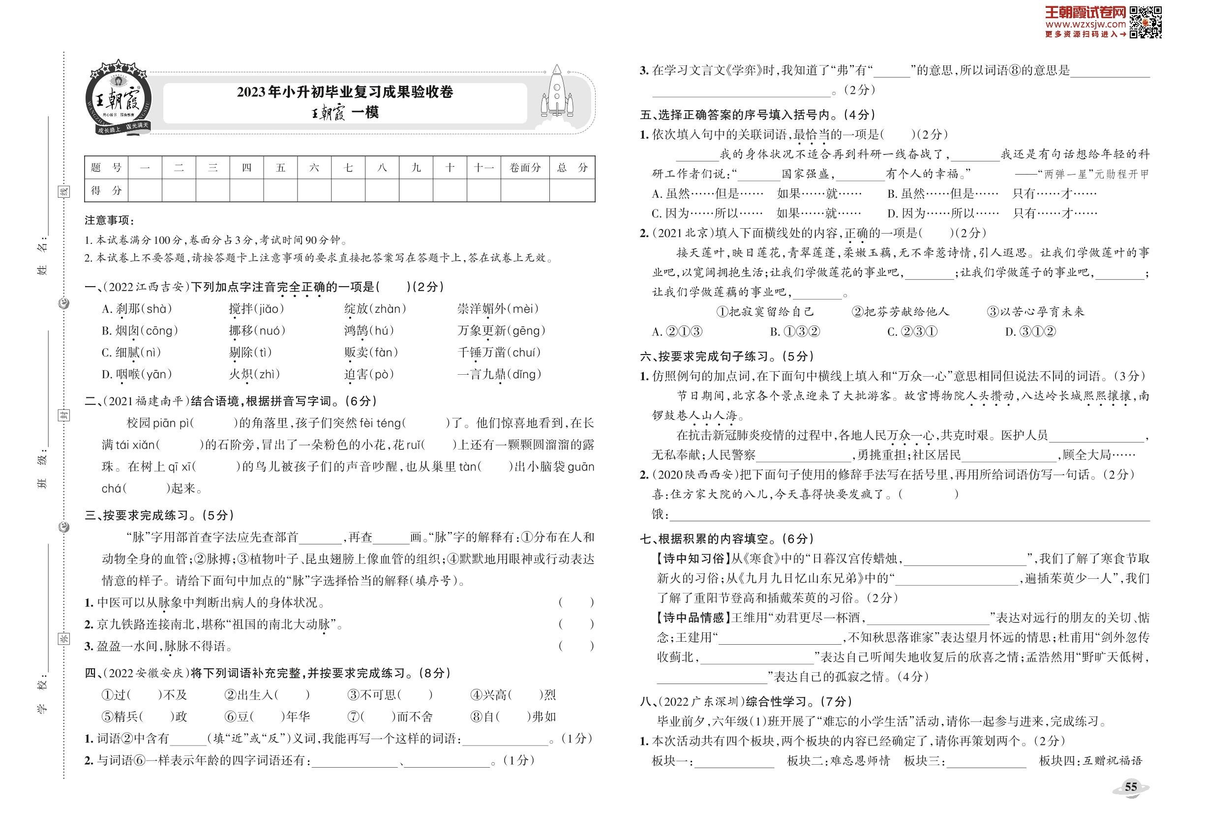 小升初语文分类集训成果验收卷·王朝霞模拟卷_R221225101203282【1】