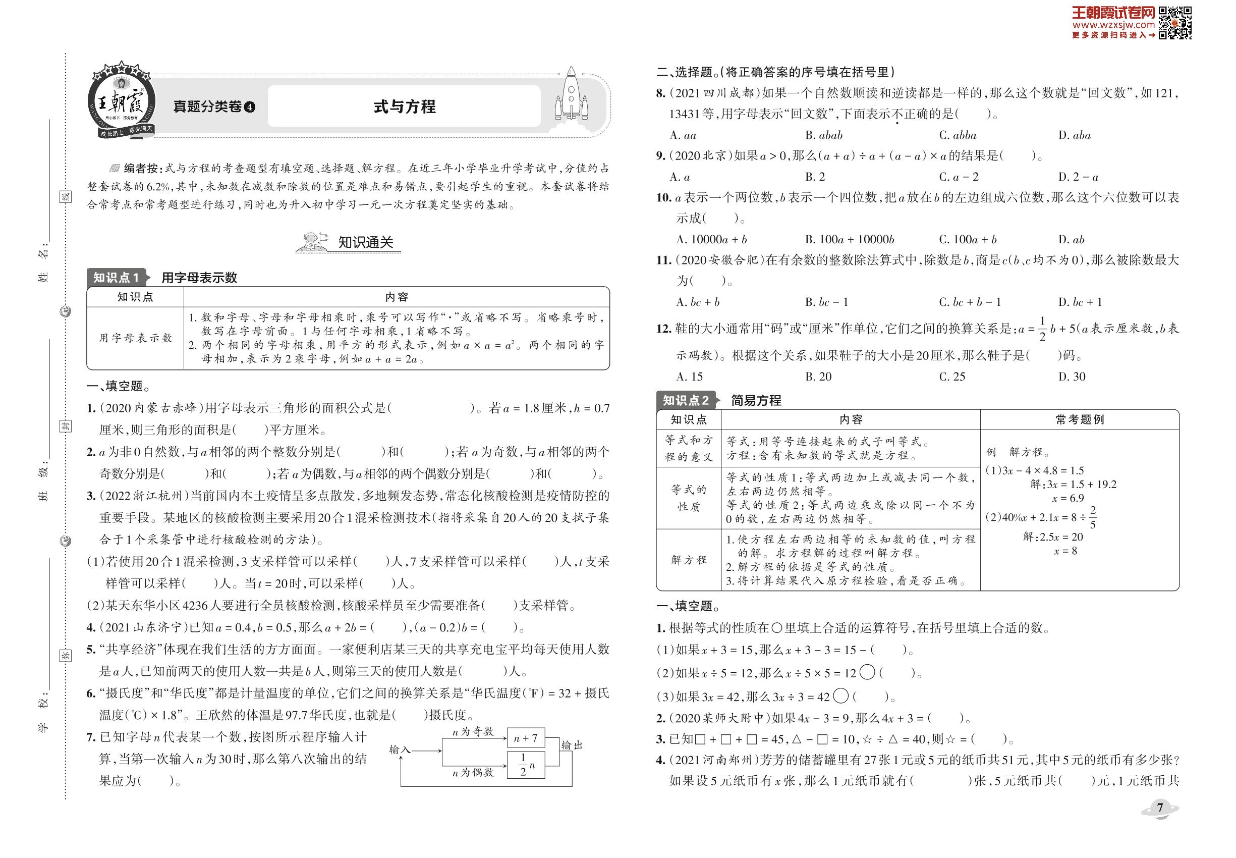 小升初数学真题分类·王朝霞精编卷——式与方程_R221225102111267【4】