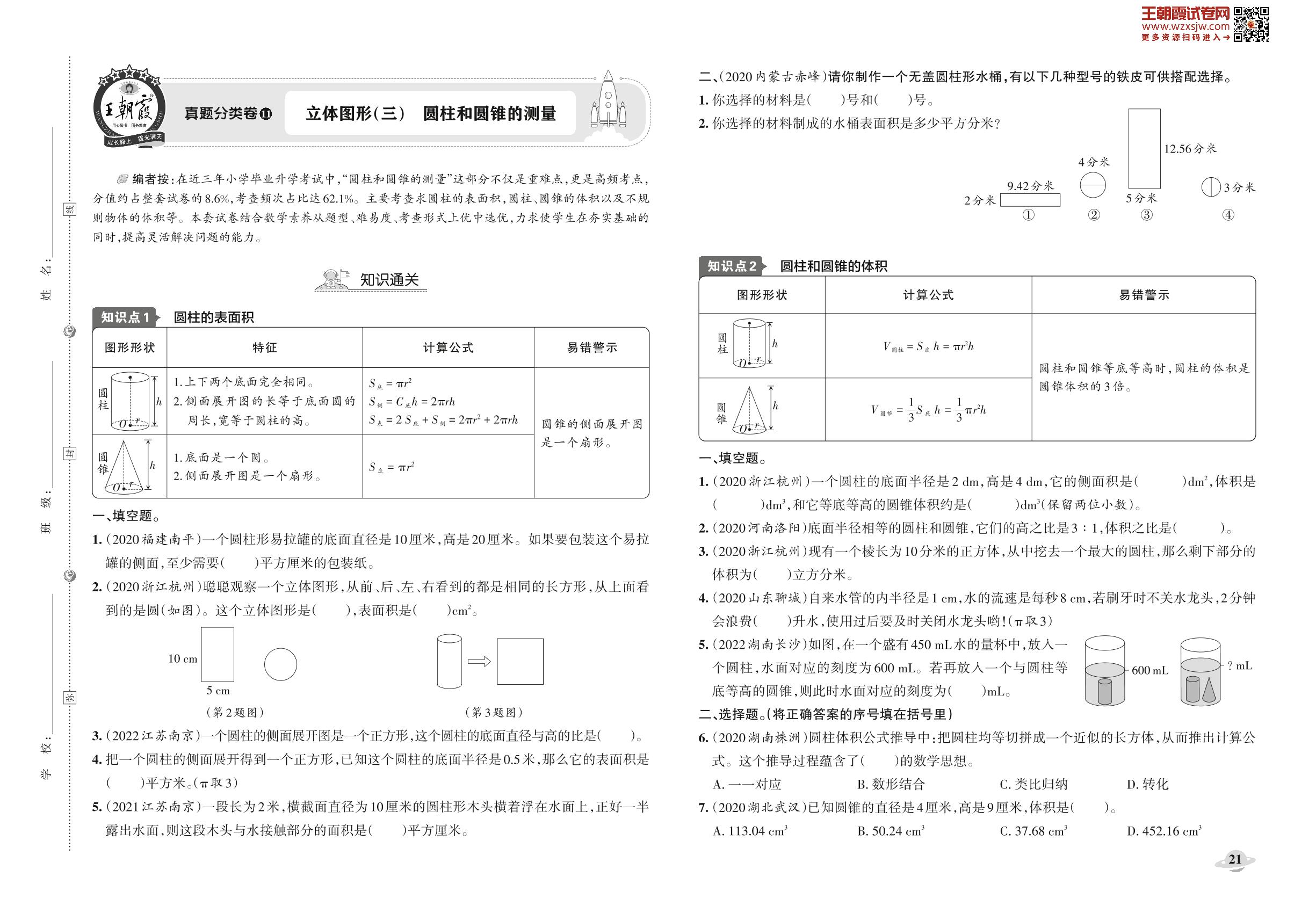 小升初数学真题分类·王朝霞精编卷——立体图形(三)圆柱和圆锥的测量【11】