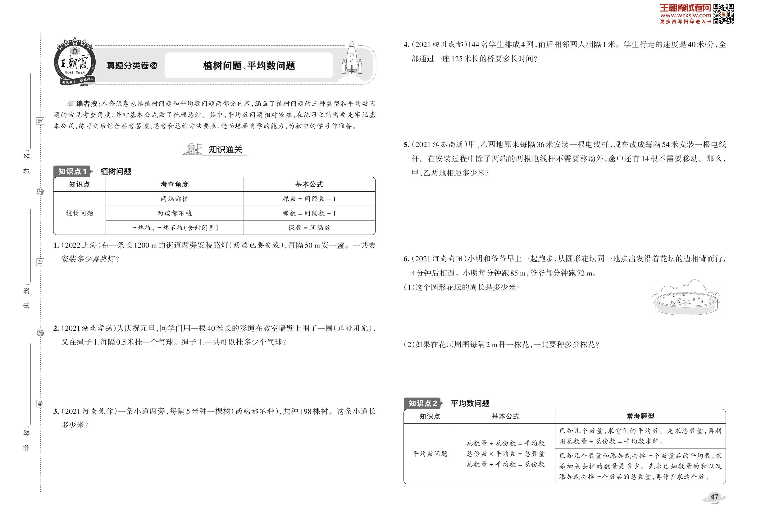 小升初数学真题分类·王朝霞精编卷——植树问题、平均数问题_R221225102114578【24】